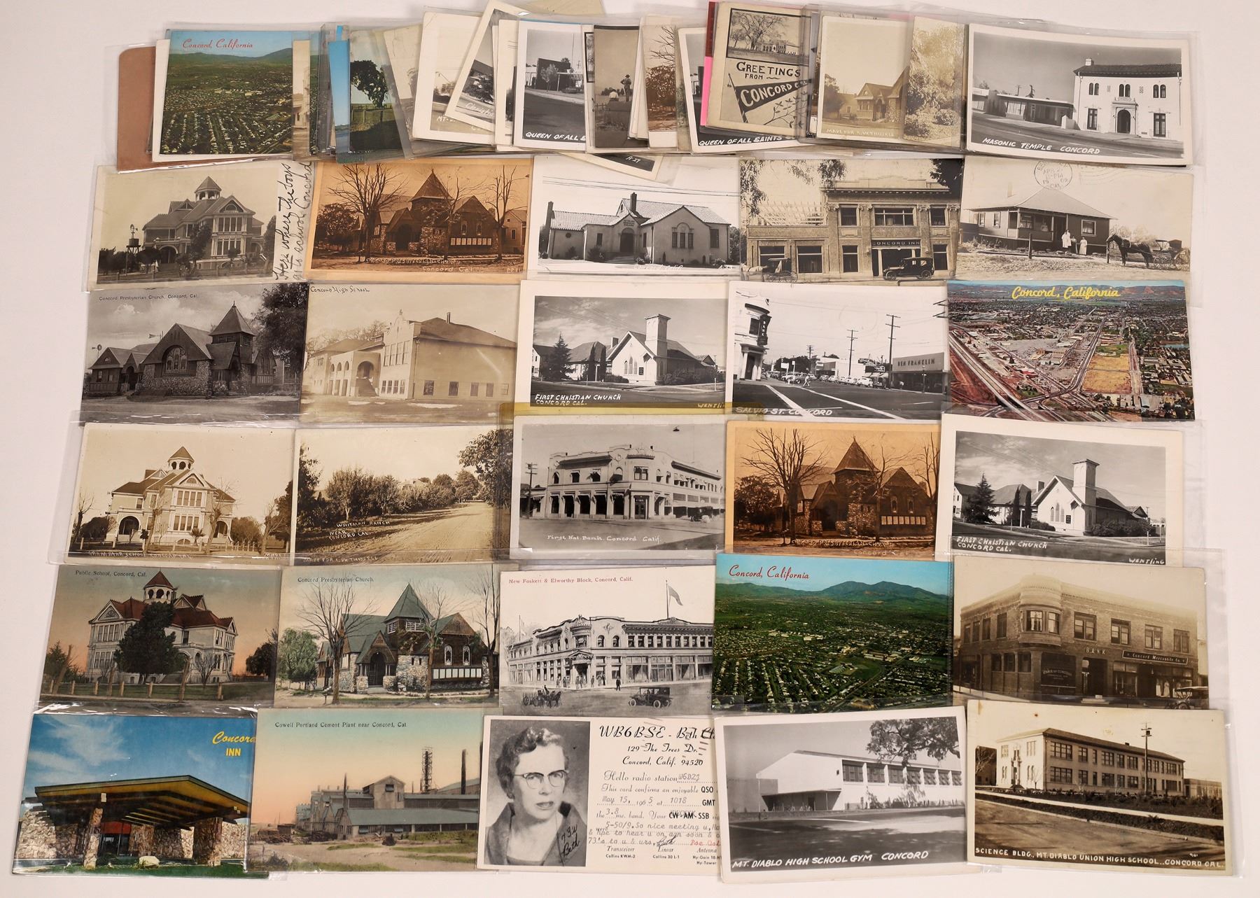 Lot of over 60 vintage postcards from Concord, Contra Costa County California. Some modern color cards of Buchanan Field, Concord Inn. Old schools, bank buildings, an old back passbook, a 1920 report card.