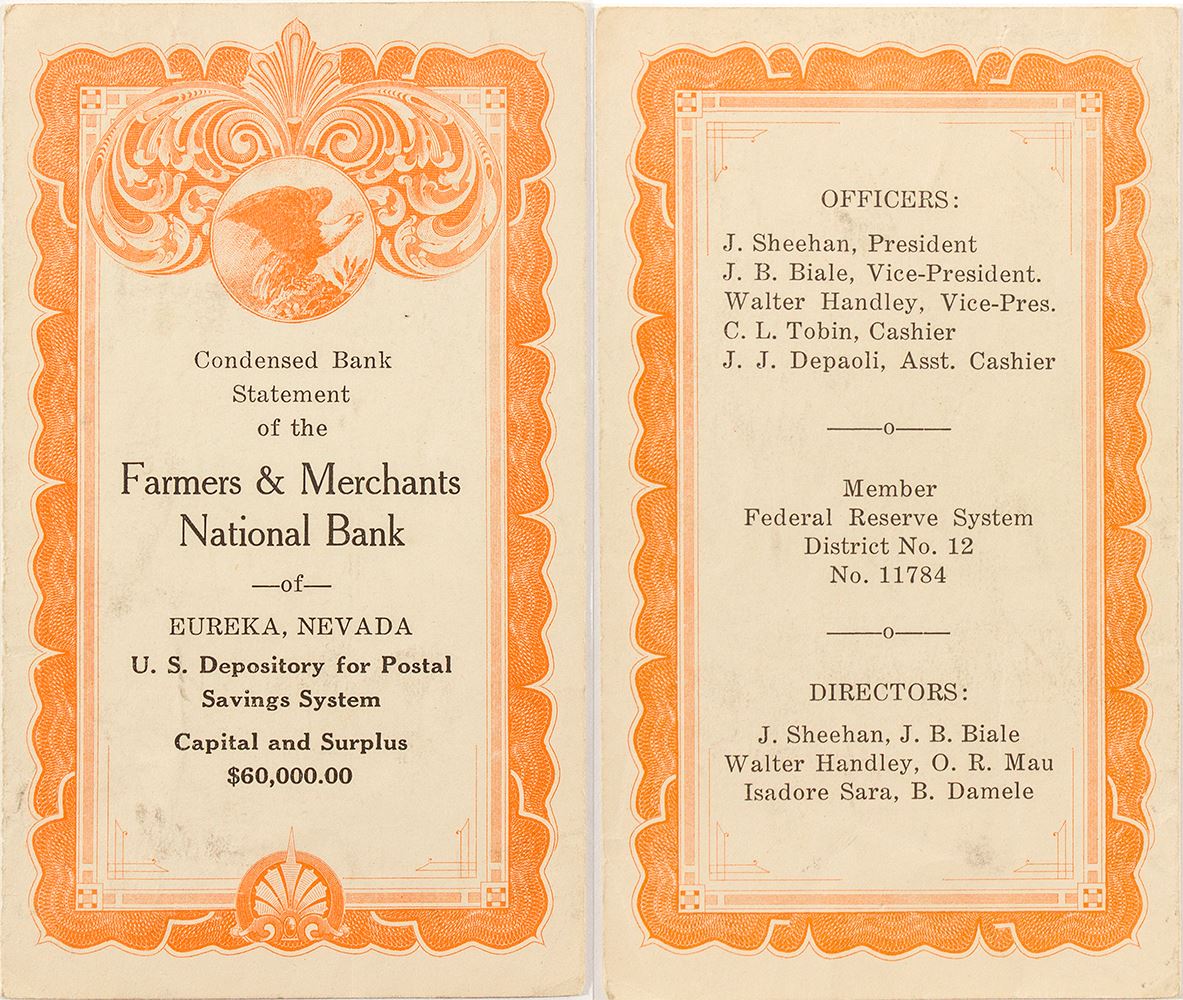 Another Nevada bank condition report (see other lots). "As Required by the Comptroller of the Currency at the Close of Business, June 29th, 1929." Orange border on front. Four pages. Inside opens to 6" x 7." Few smudges, overall very good.
