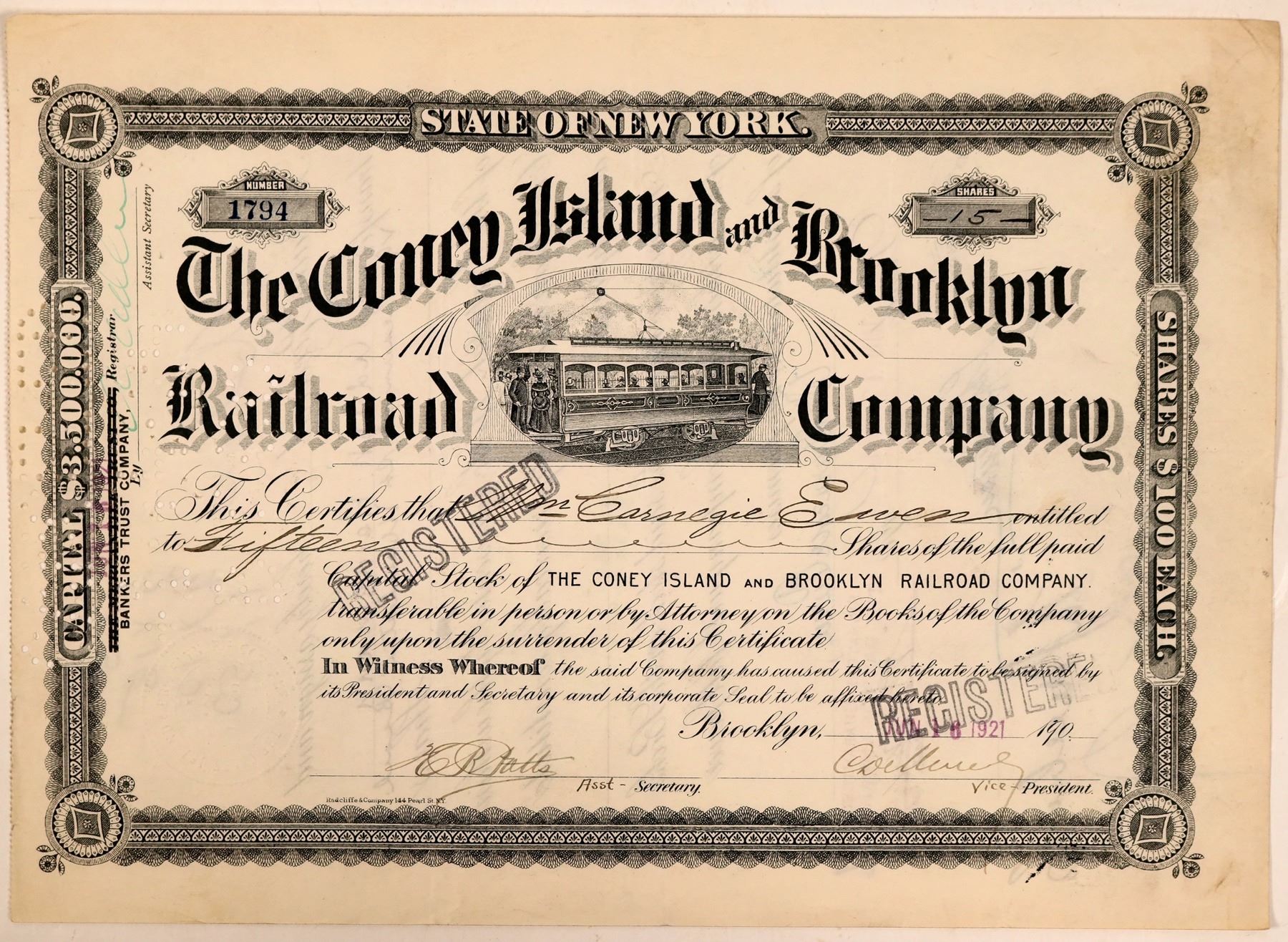 Cert. #1794, issued for 15 shares to Wm. Carnegie Ewen and signed by the company officers. Electric streetcar runs left to right. Punch and stamp cancelled. Radcliffe & Co., N.Y. Capital was $3.5 Million with shares $100 Each.