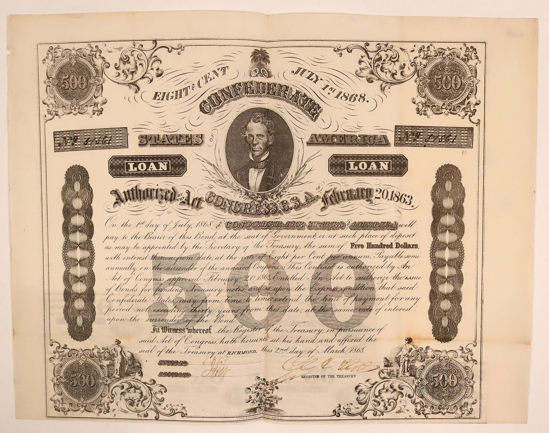 Very nice confederate bond issued at Richmond, Virginia in 1863 for $500. In very fine condition. Seven coupons below. CR 124.