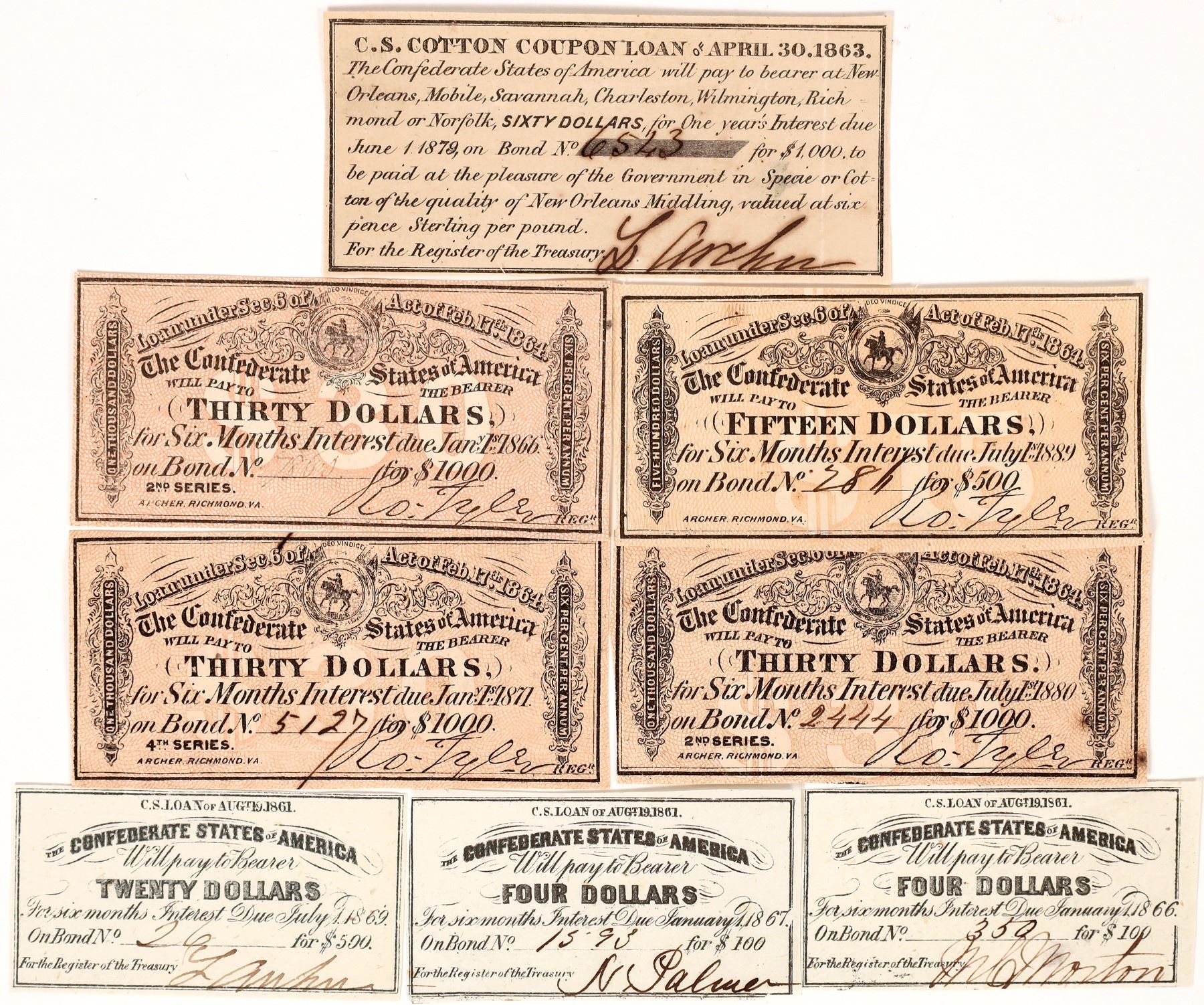 Lot of eight Confederate Bond coupons: 1863 CSA cotton coupon $1000 bond, also $4 1866, $4 1867, $20 1869, $15 1889, $30 1866, 1871, 1880.