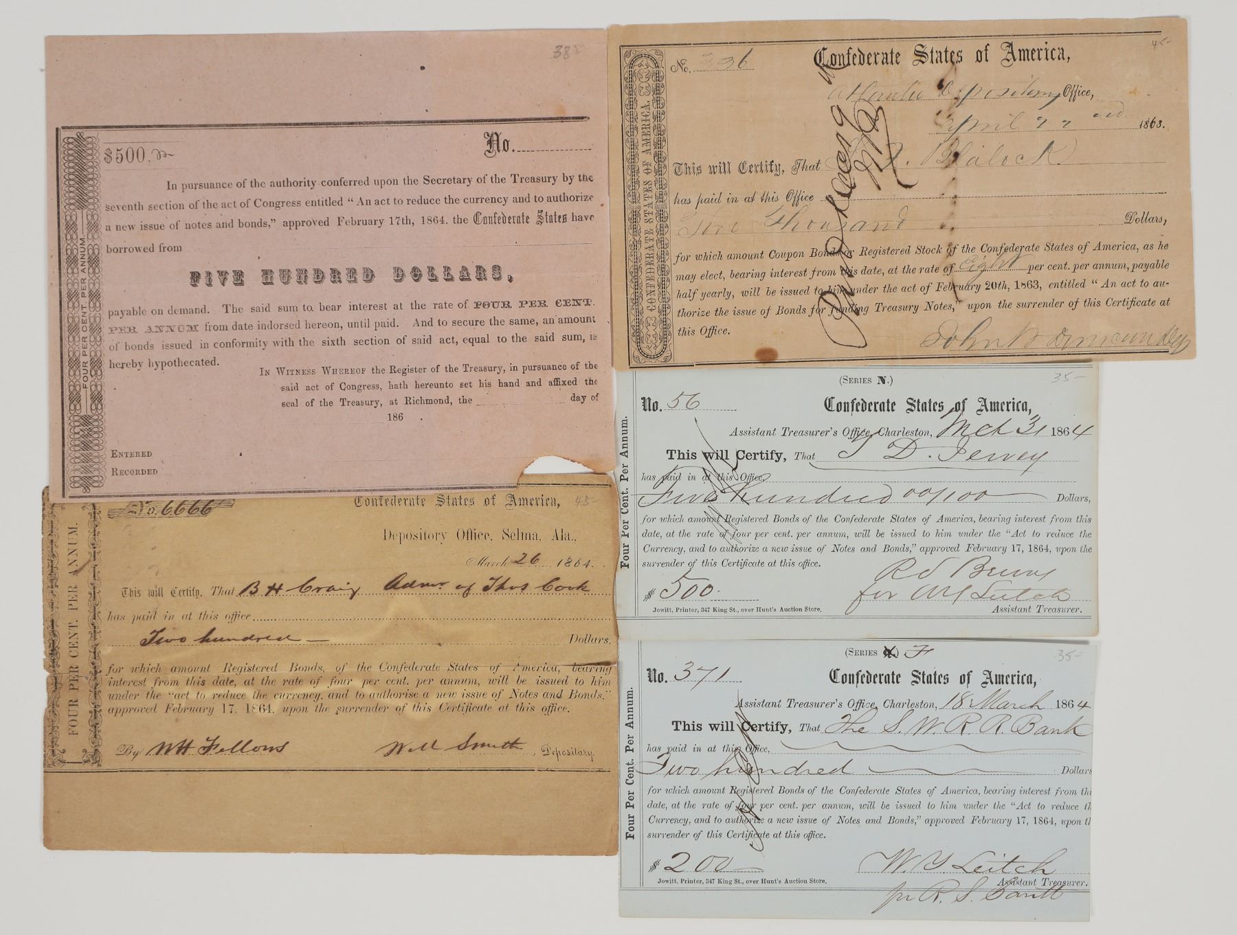 Lot of 5. All are 4%, bond purchase receipts. Four are for payments of $500 and one is for $200. All but one for $500 was issued. Issued to continue to fund the war. Rare. 200710