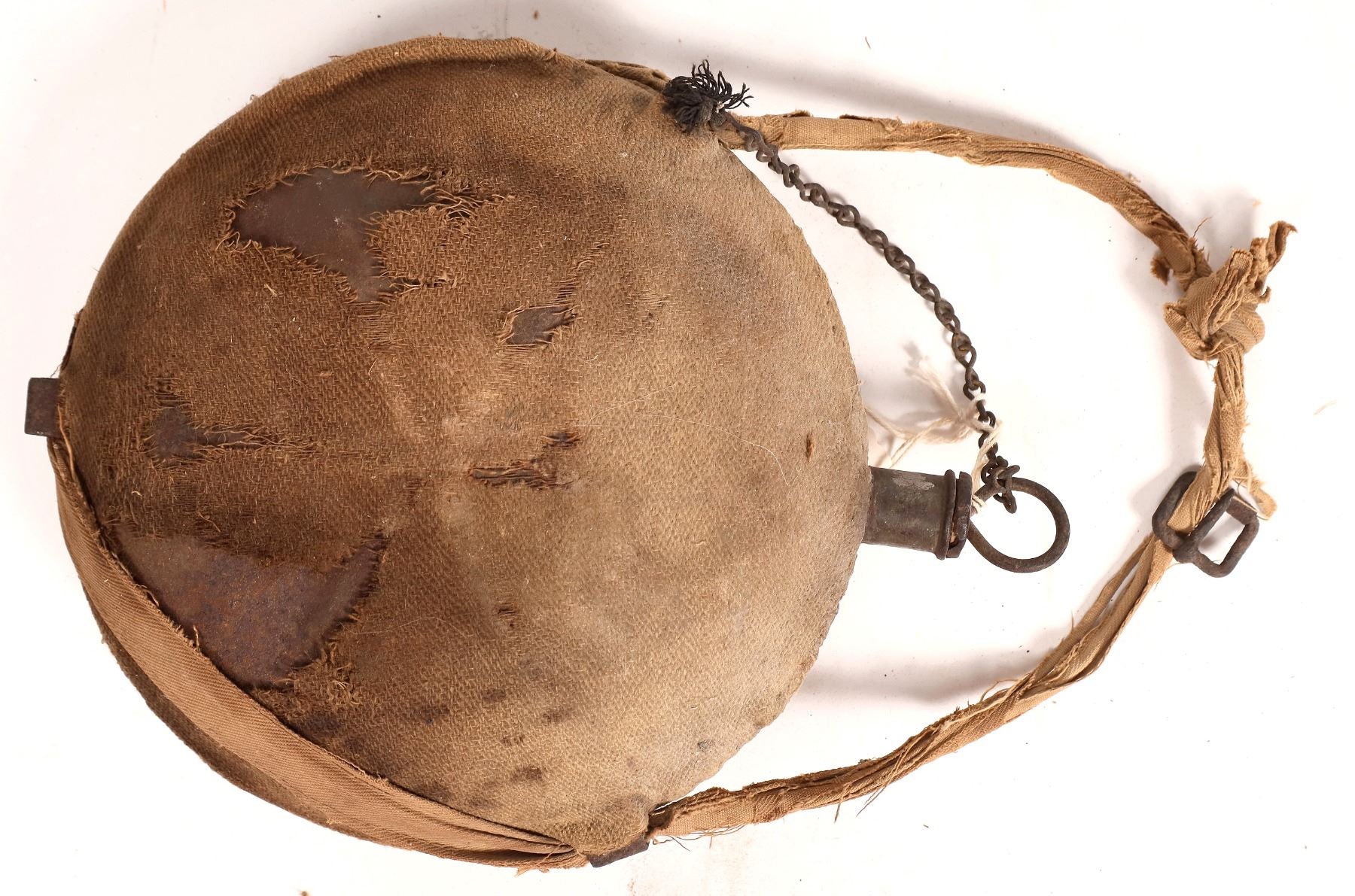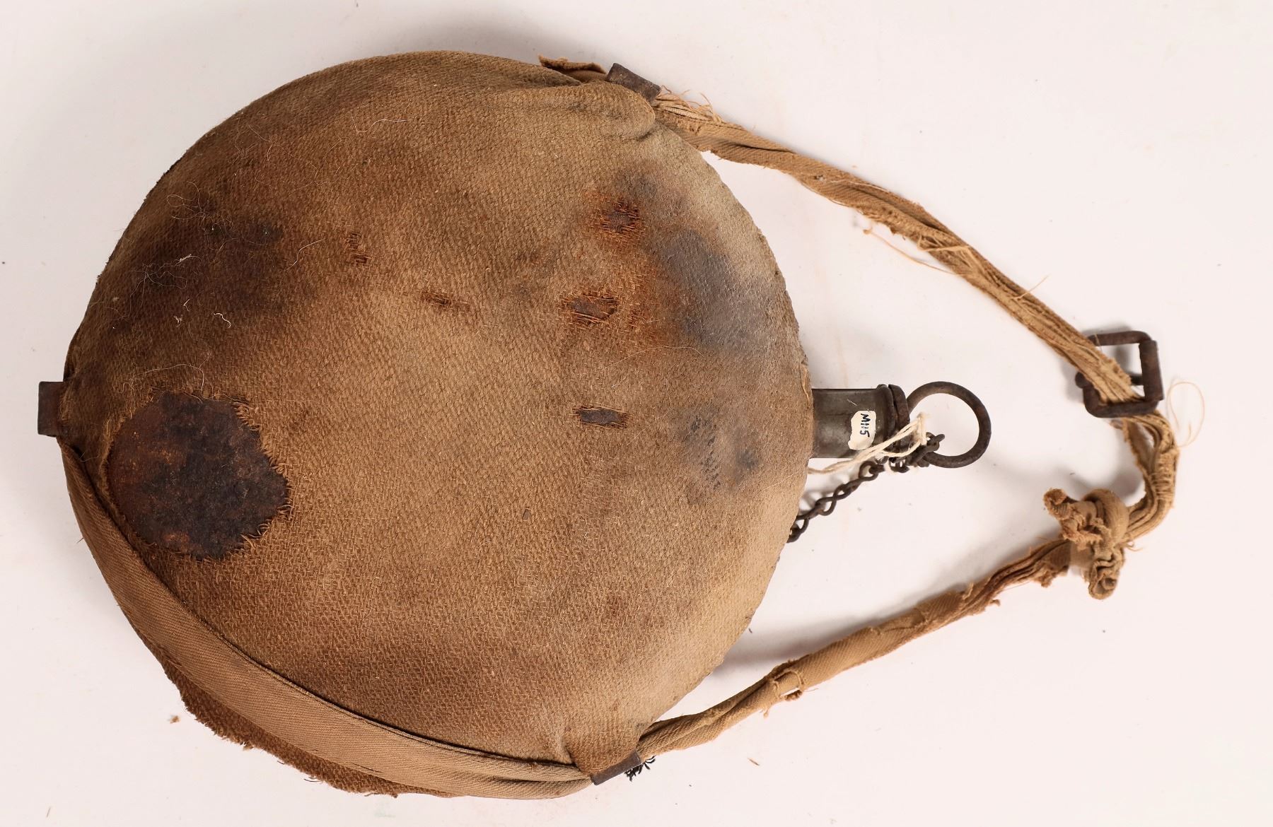 This canteen is 8 in. in diameter with a tan colored canvas cover and cloth strap. The neck is narrower that the Union model. Complete with lanyard and cork. Shows considerable wear.