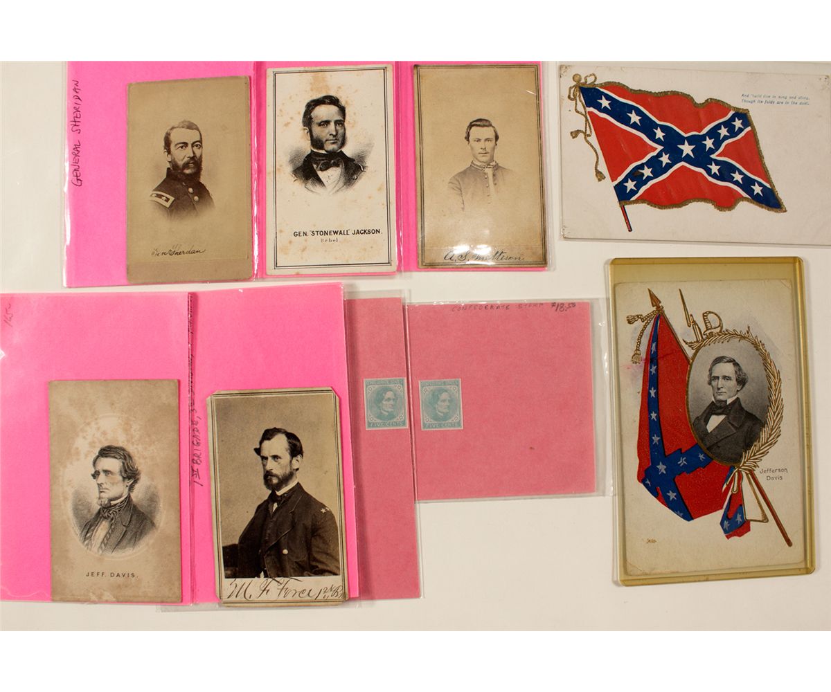 Lot includes CDVs, postcards, and stamps. CDVs: A.S. Matteson (1864), Gen. Stonewall Jackson, Jefferson Davis, and Gen. M.F. Force (Alabama). Postcards: two that feature Confederate flag (one with Jefferson Davis too). Stamps: two 5 cent Confederate States stamps. Prag Collection