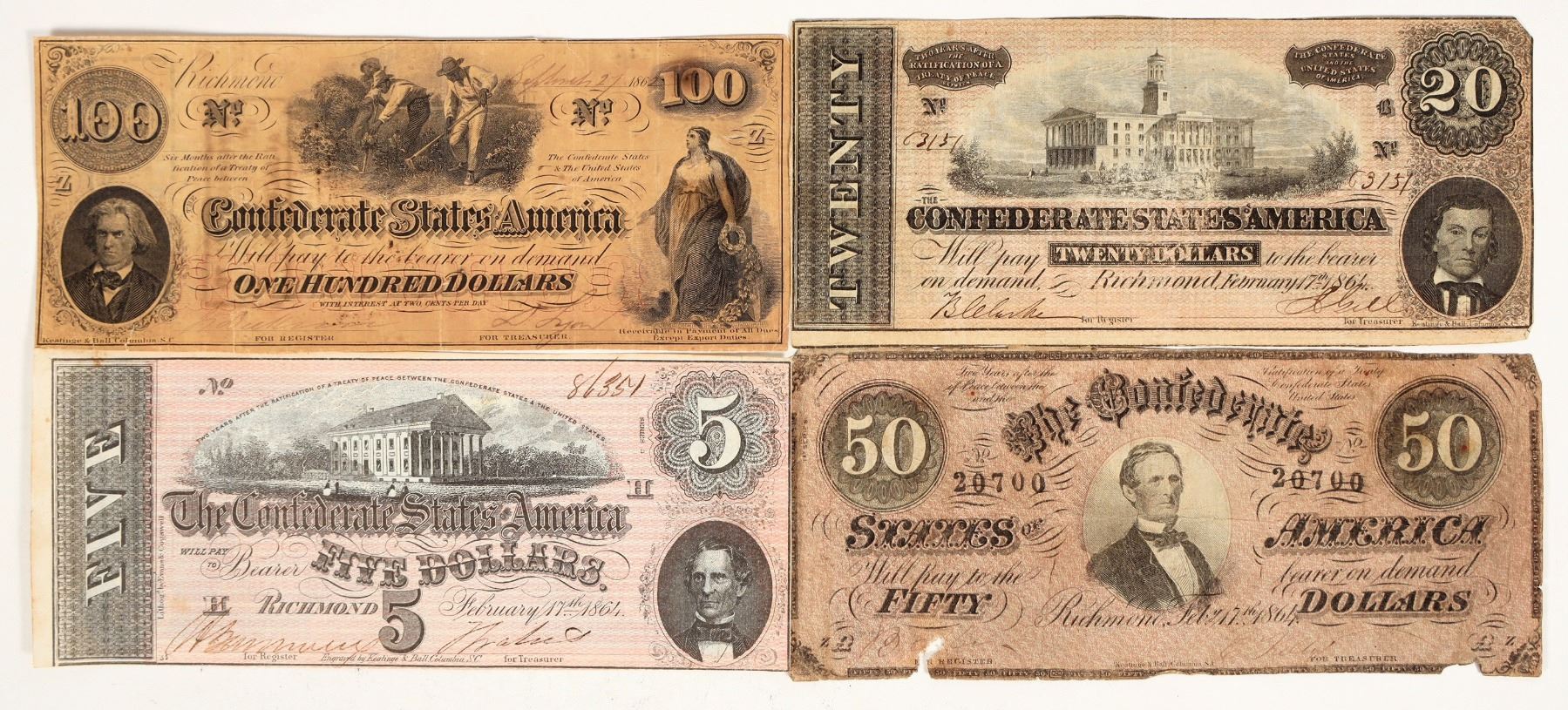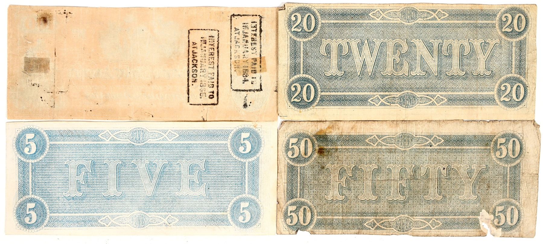 Collection of Confederate bank notes: 1) T 41: one hundred dollars, field hands ho cotton. 2) Confederate five dollar note, 1864. 3) 1864 fifty dollar note. 4) 1864 twenty dollar note. 5) 1864 ten dollar, type 68.