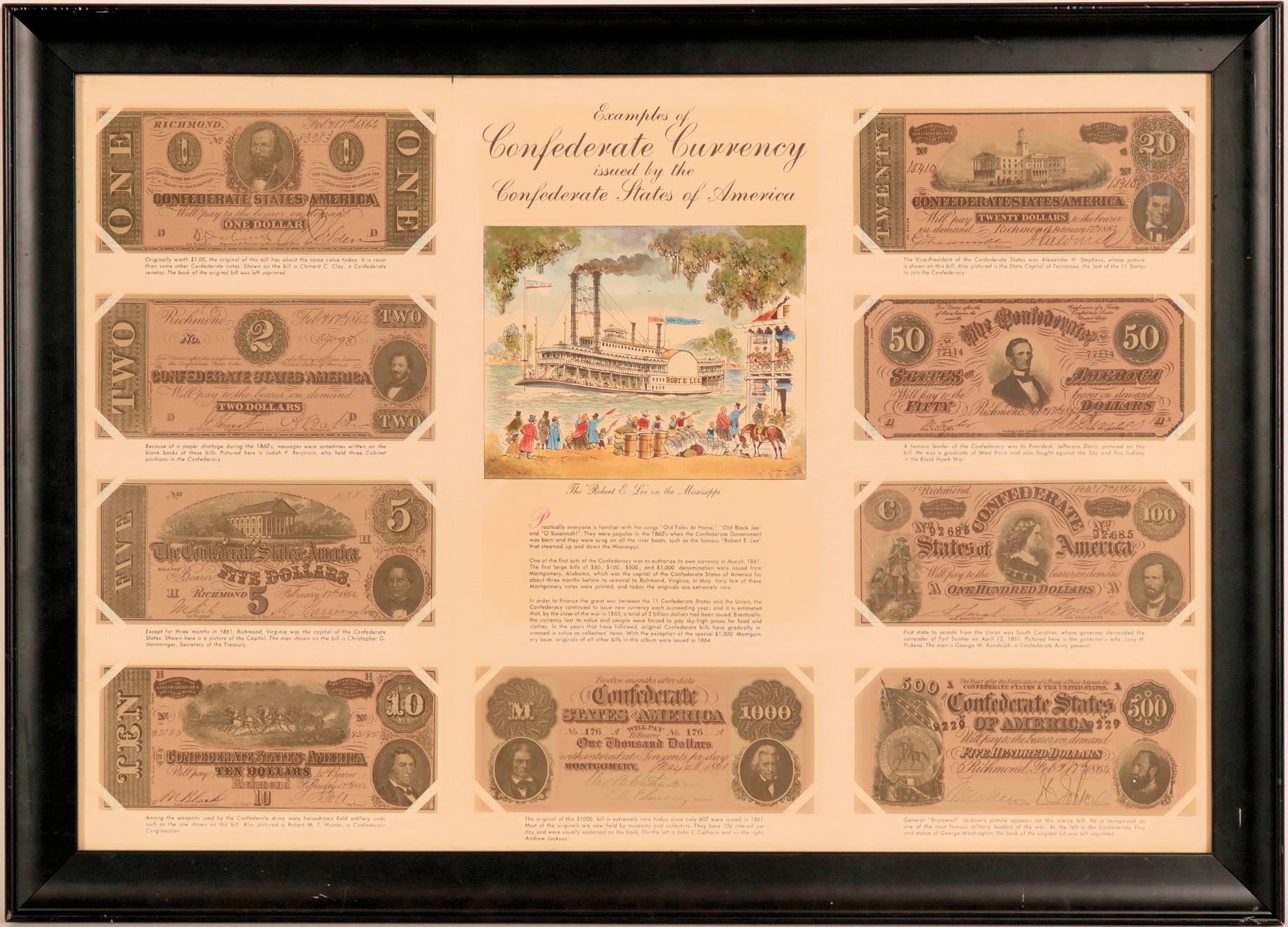 This is a marvelous framed piece with nine different quality reproduction Confederate notes and descriptions. We sold this years ago and it came back for another round! 19.5 x 27.5", excellent condition.