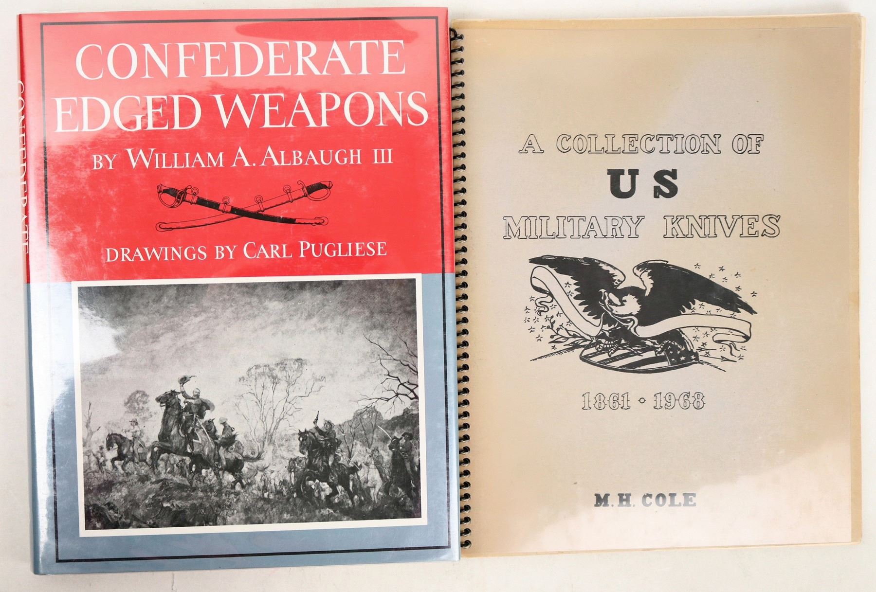 These two books will cover knives and edged weapons of the Civil War for the North and the South. "Confederate Edged Weapons" by William Albaugh is pp.198 with spectacular drawings, 1993. Extensive research went into this book. Red/grey canvas cover with DJ in like new excellent condition. A research standard to identify the fakes. The second book is a spiral bound paperback "A Collection of US Military Knives" by M.H. Cole, 1968. Drawings rather than photos very detailed at 85 pages. In very good condition. Please see photos for details.