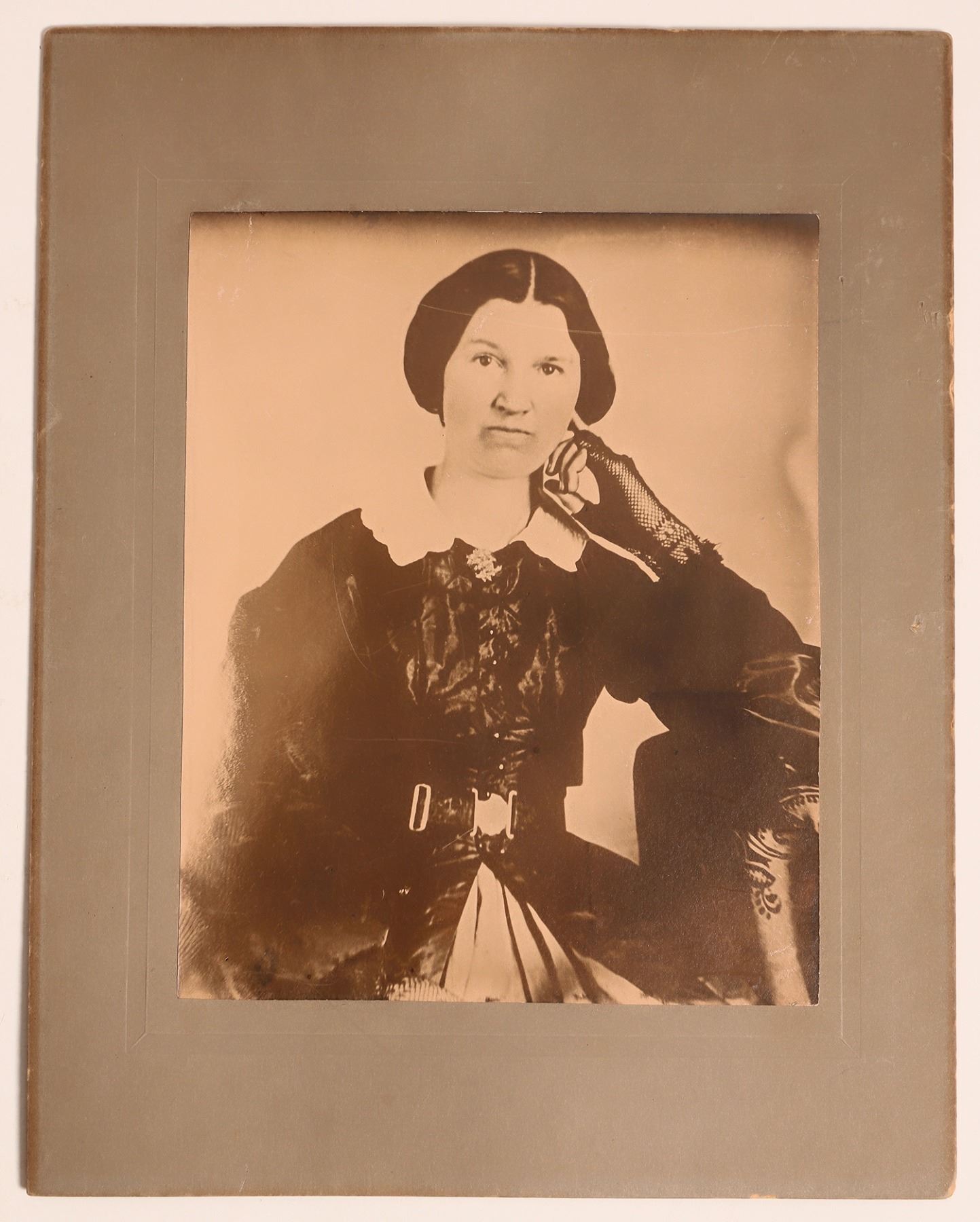 This is a 11"x 14" albumen photo of Confederate spy, Rose O'Neal Greenhow (1813-1864), a socialite in Washington D. C., she used her connections to pass along military information to the Confederacy. Jefferson Davis said she was responsible for the South winning the First Battle of Bull Run in 1861.