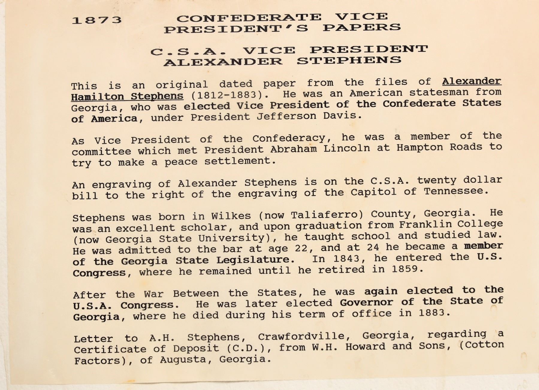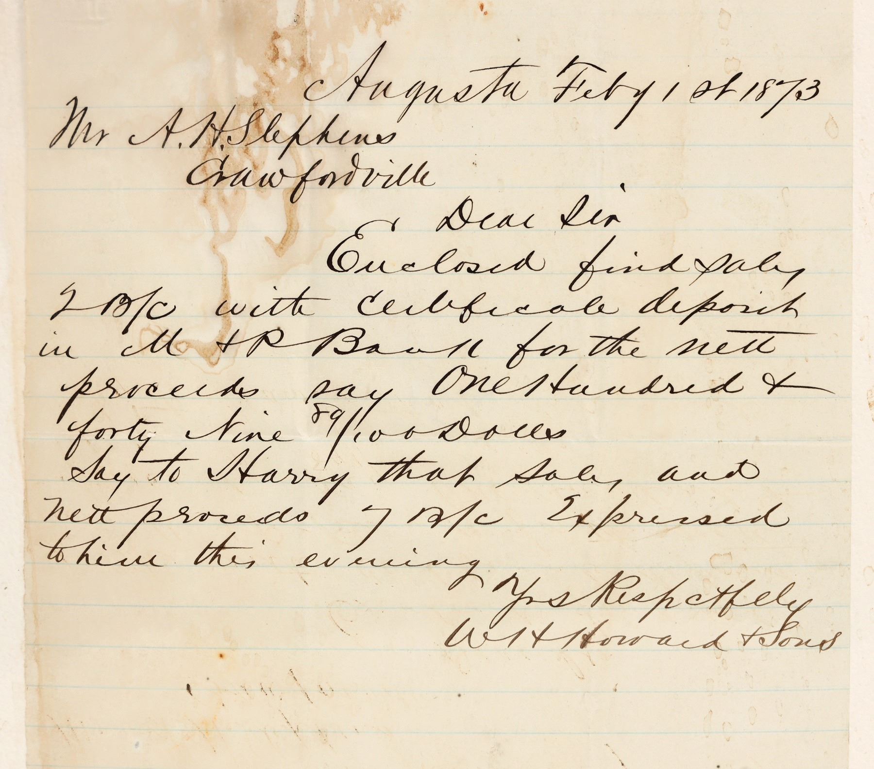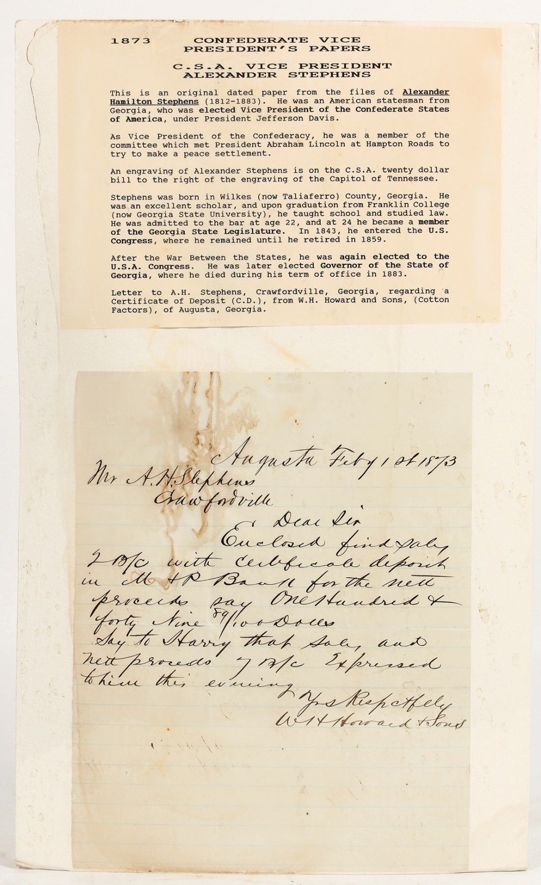 Letter to CSA Vice President from H. Howard and Sons Augusta 1873 regarding banking matters. Alexander H Stephens was the first and only vice president of the Confederate states from 1861-1865.