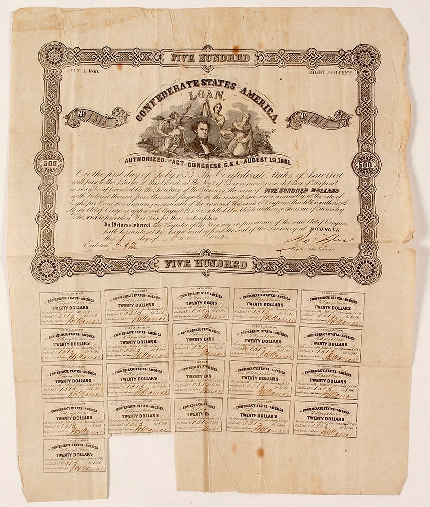 Authorized by the Act of Congress C.S.A. of August 18, 1861. $500 bond issued Nov. 1, 1862 in Richmond. Allegorical vignette. 21 coupons remaining. Many folds and creases, some staining & foxing, wear to edges. Please inspect. (Al Adams Gold Rush Memorabilia Collection) Date: Location: Richmond, Virginia HWAC# 59094