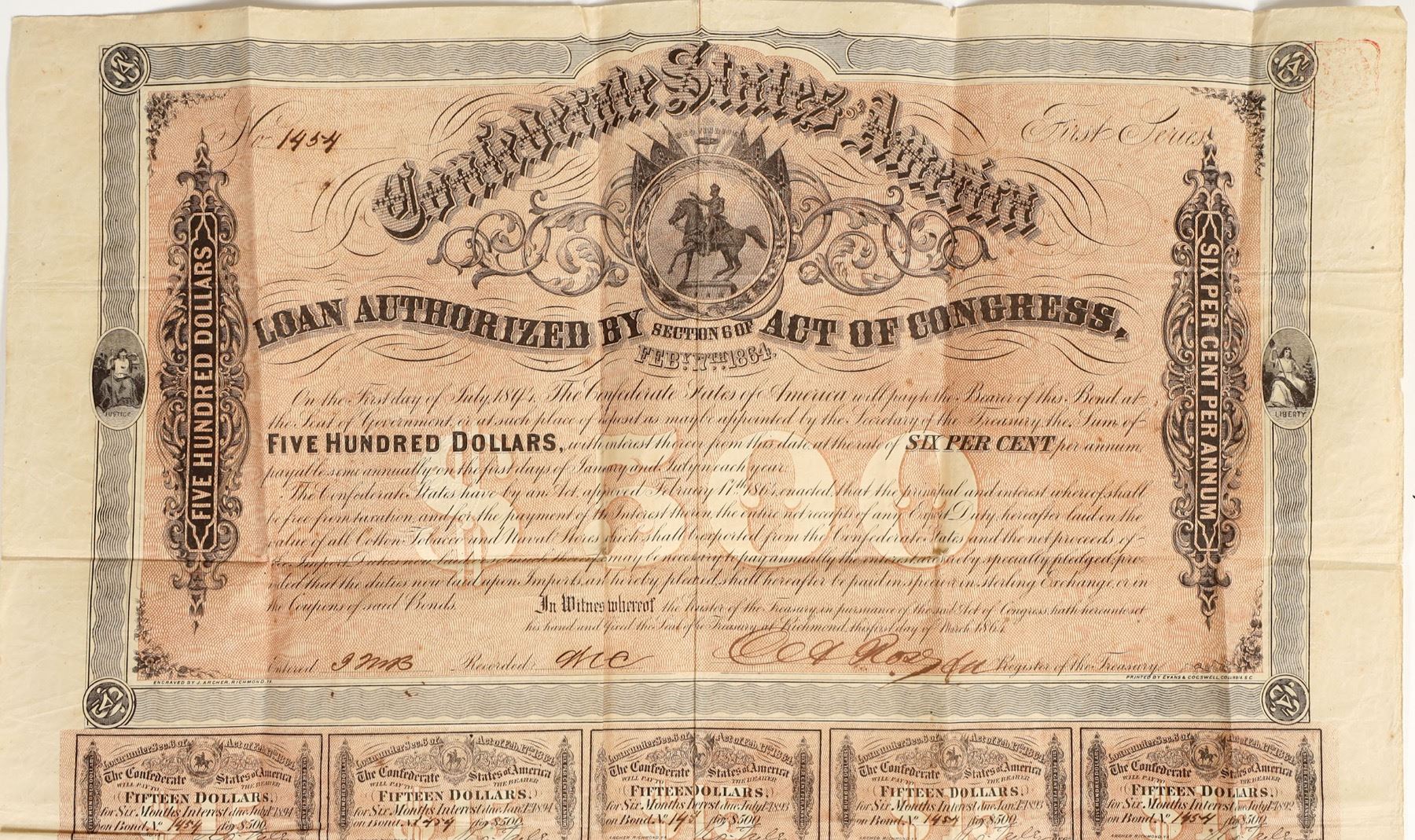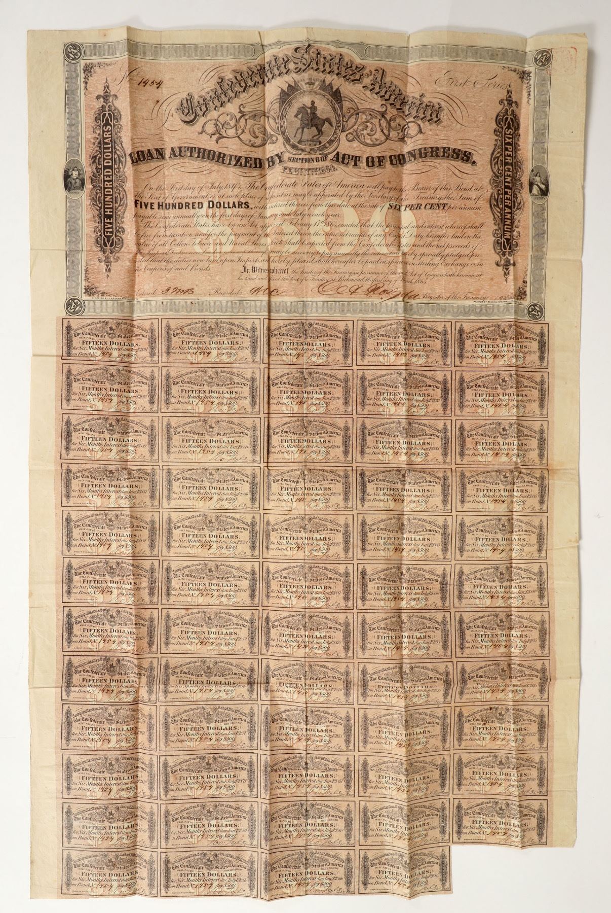 Criswell 143, R4. First series, $500 bond. March 1st, 1864. 25 x17" Folds, creases, at least one coupon missing.