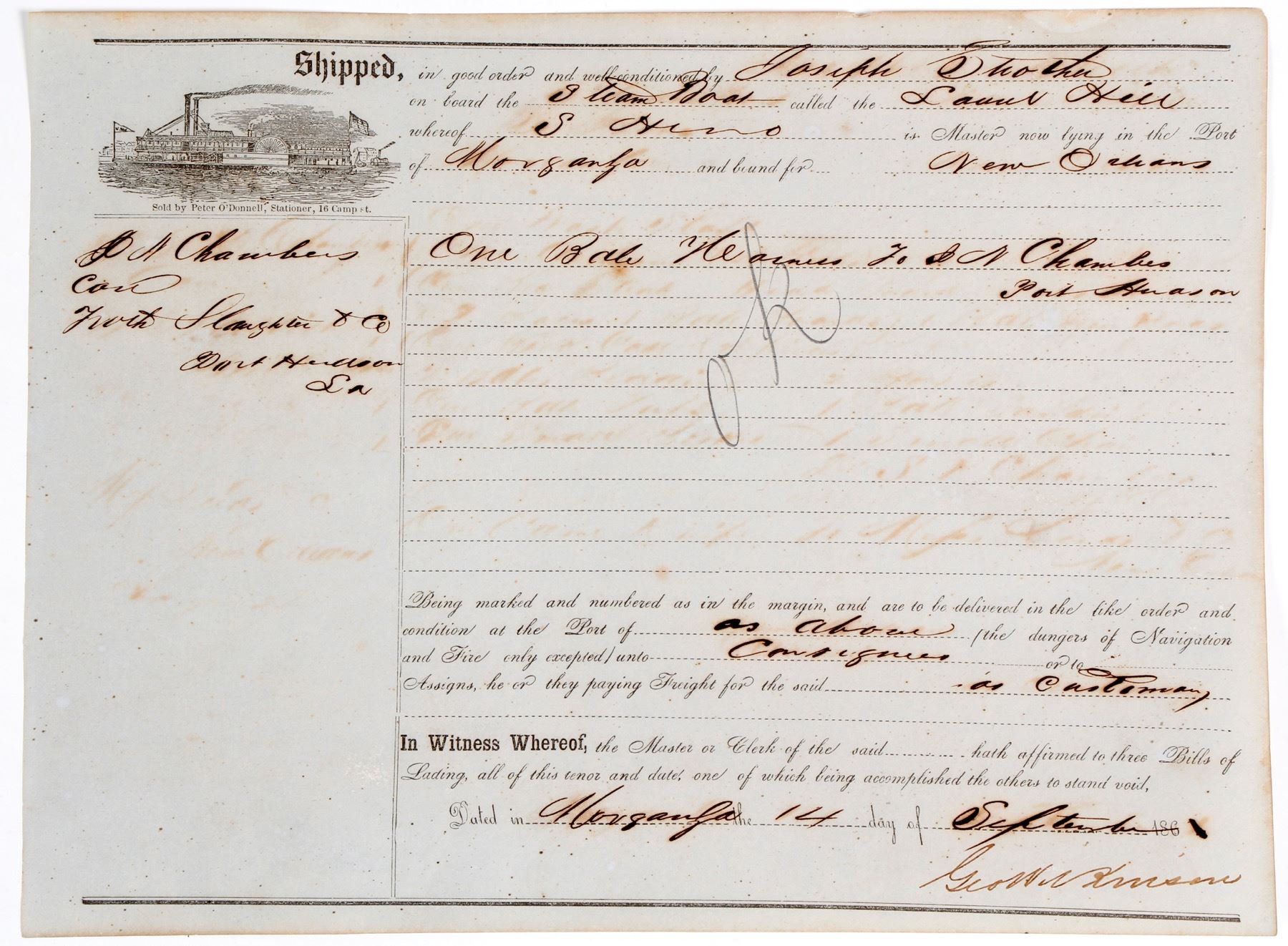 Bill of lading describes cargo transported from the Port of Morganza to New Orleans. Part of River Defence Fleet of steamers converted to Confederate use. Nice steamboat vignette. City: State: Date: 1861