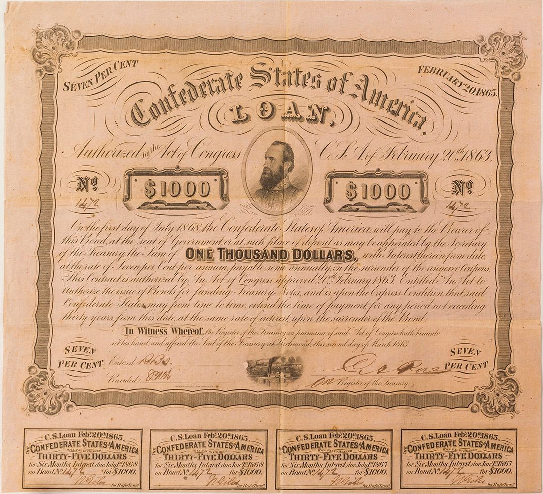 Criswell 122 R4. Act of 1863, Confederate $1000 7% bond, #1472. Date: Location: HWAC # 54663