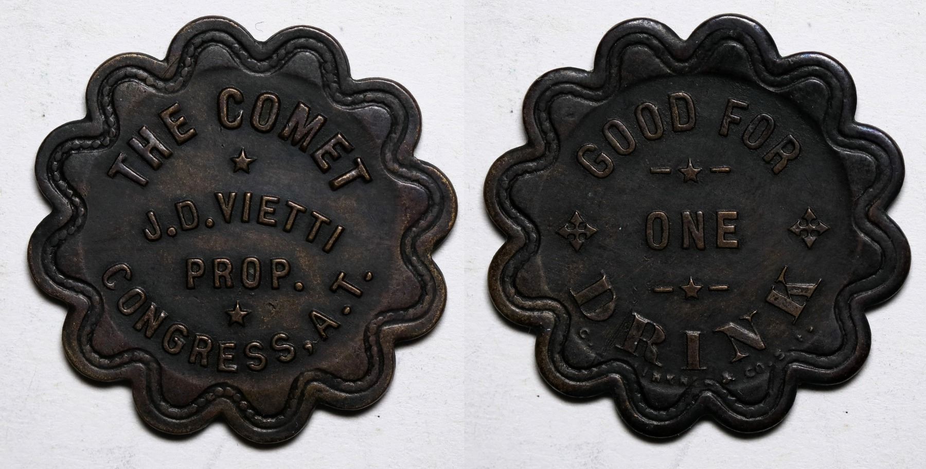 The Comet / J.D. Vietti / Prop. / Congress A.T.// Good For / One / Drink. 12 Scal., Br., 26mm. Nice high quality territorial ghost town token.