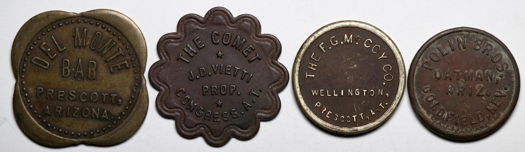 Lot of 4. 1. Polin Bros/Oatman/Ariz/ Goldfield , Nev//Good For/6 1/4¢/In Trade/. RD, Br, 26mm. 2. The Comet/ J.D. Vietti/Prop/Congress A.T.//G.F.//ONE //Drink. 12 Scal., Br., 28mm. 3. Del Monte/BAR/ PRESCOTT/Arizona// 12 1/2. 4 Scal., Br, 29mm. 4. The F.G. McCoy Co./Wellington,/ Prescott, A.T. Rd, Br, 21mm.