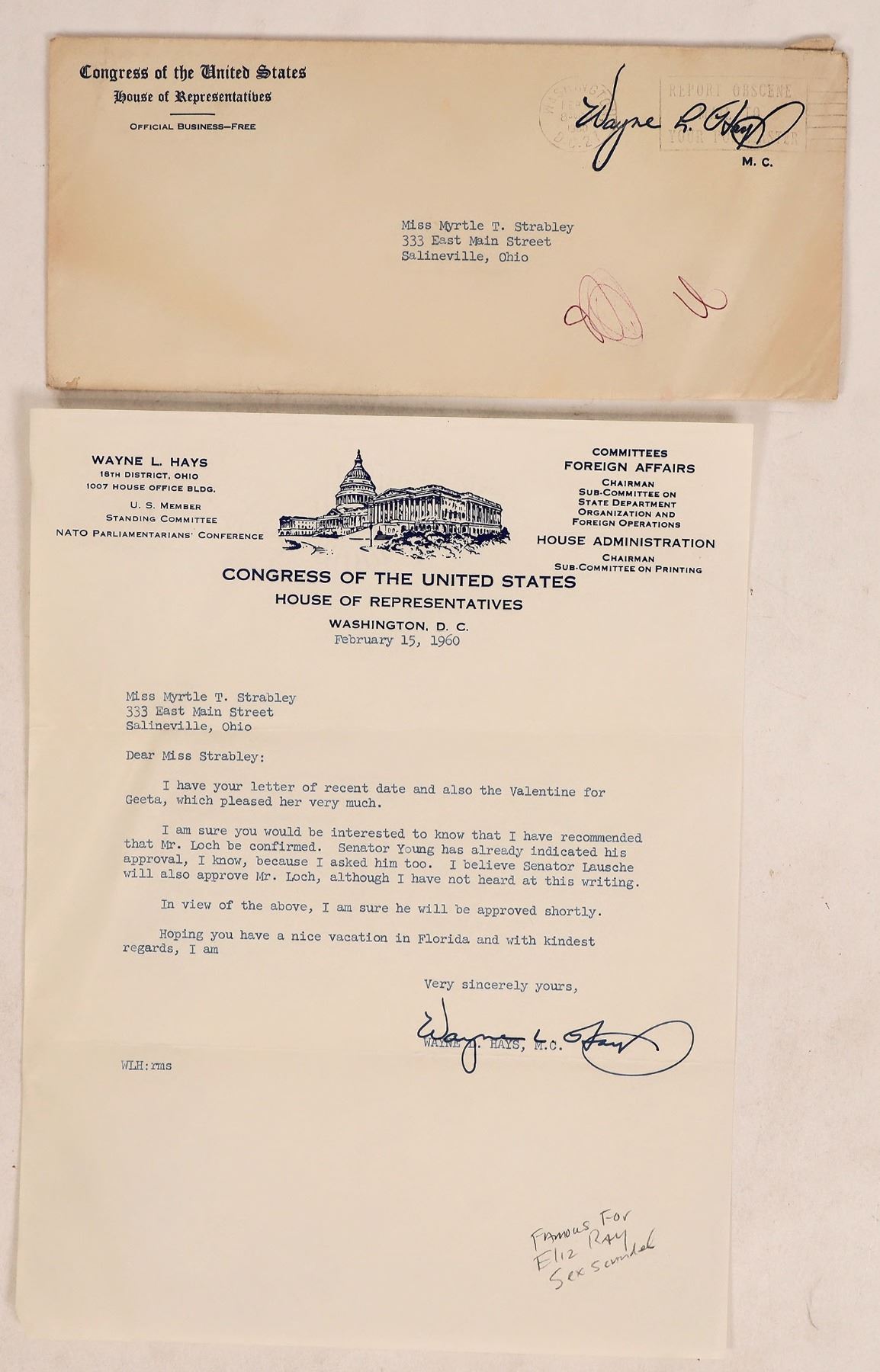 A letter from Wayne Levere Hays to a Miss Myrtle Strabley, c1960, saying that he recommended a Mr. Loch's confirmation. Has canceled cover. Hays, who served as a U.S. Representative of Ohio, in the Democratic Party, from 1949 to 1976, resigned from Congress after a much-publicized sex scandal brought about when his former secretary went public about being his mistress.[ Ohio