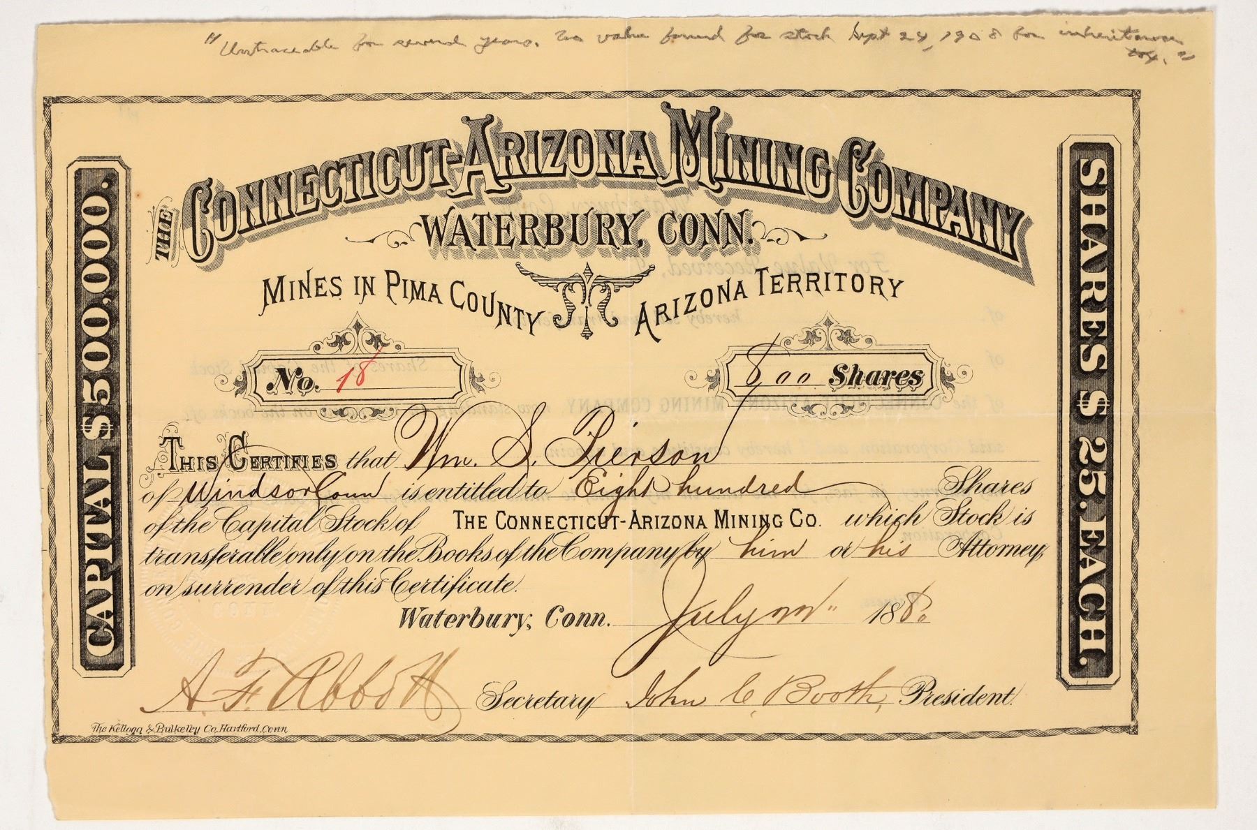 Rare. "Mines in Pima County Arizona Territory" printed under title. No. 18, issued for 800 shares to WM. S. Pierson in Waterbury, Conn. in 1880. Signed by president John Booth and secretary Abbott. Not cancelled. Fancy script font. Folds, trimmed left border, pencil writing at top. Operated at Arivaca, Pima County.
