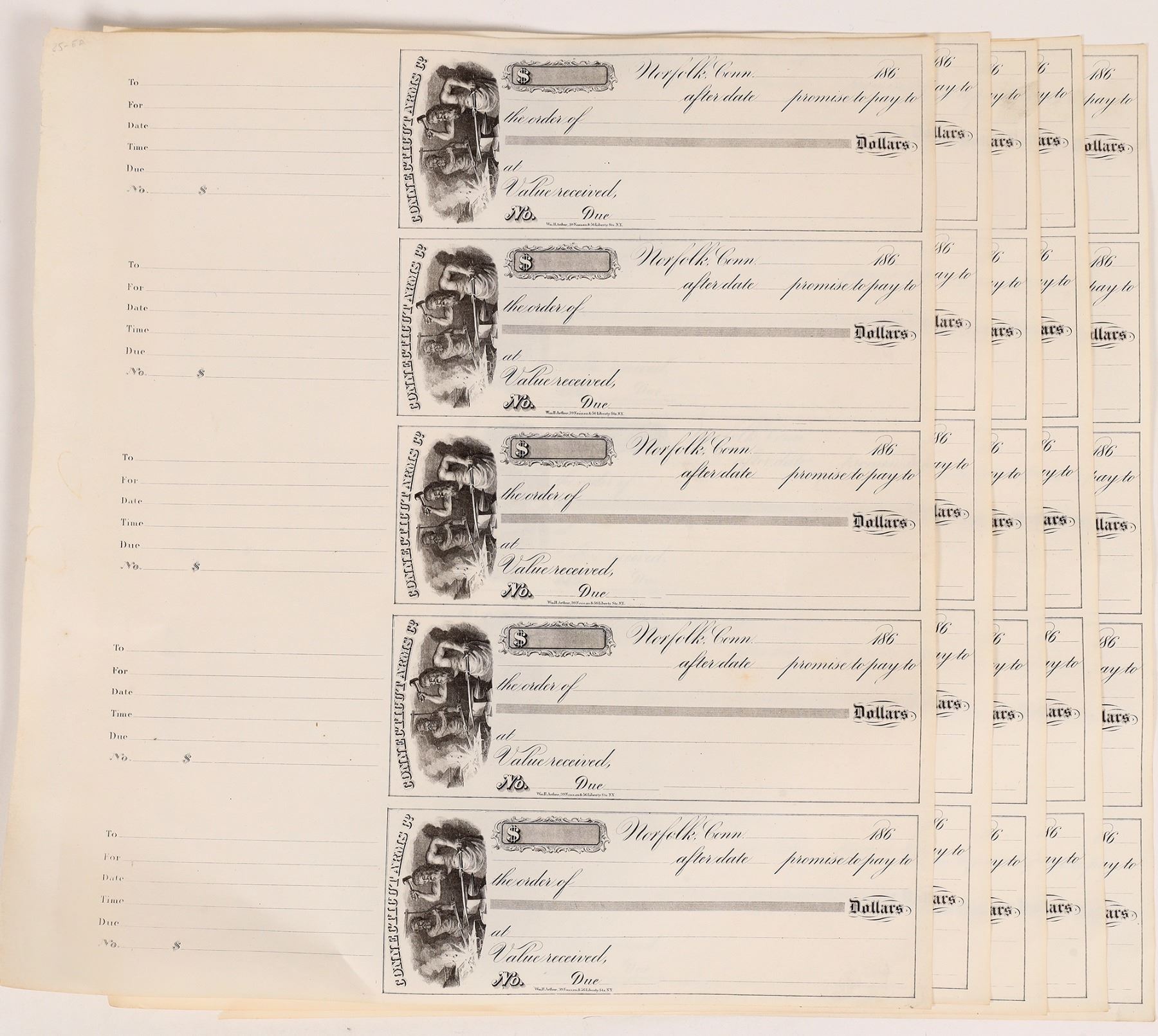 This lot holds four sheets of unissued checks from the Connecticut Arms Company of Naubuc, Conn. by brothers Henry and Lewis Hammond. A total of 20 checks and registers. Each check is dated to 186_. The Connecticut Arms Co. ran from 1863 to 1868 producing Bulldog style derringers in a hefty .44 caliber. In very good condition.