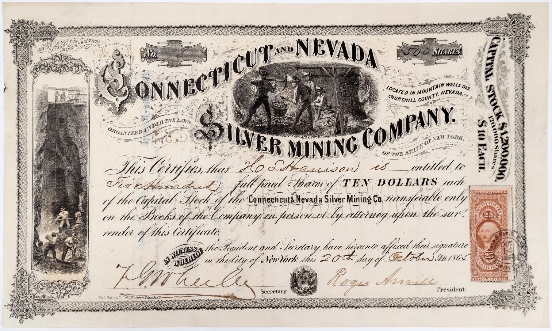 AND signed by president Averill!!! The mine owned the mining camp of Averill which was in the canyon below the county seat of La Plata, Churchill County. This certificate is signed by president Roger Averill, Lieutenant Governor of Connecticut. No coincidence here. # 78 for 500 shares to H. S. Harrison on October 20, 1865. Signed by secretary F. M. Wheeler(?) and president Roger Averill. Located in Mountain Wells district, Churchill County, Nevada. Issued in payment for mining property. 25c Certificate revenue stamp. Pre-stamped with circular October 14th stamp. Minor issues (nick top center, small tear bottom left), over all extremely nice! Two underground mining vignettes. Fred Mayer & Co., lithographer, New York. The Connecticut and Nevada had seven ledges and were working on three: the Satellite, Vermont and Washington. They had 2,000 feet of tunnels and shafts. Rock near the surface assayed at $30 to $135 and at one hundred and forty feet $1,500 a ton. The Mountain Wells district is usually referred to as the La Plata district. Includes more information on the mine, rare camp, and Averill.