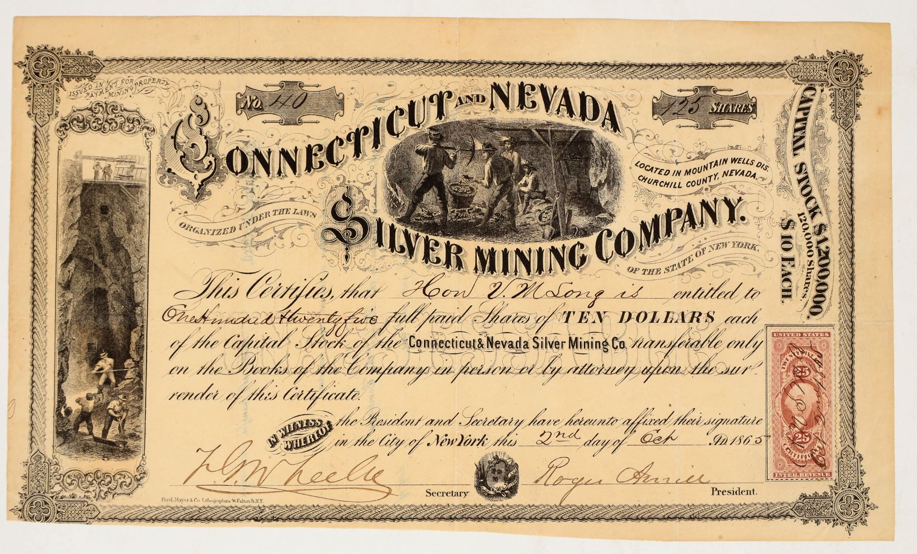 This mine owned the mining camp of Averill which was in the canyon below the county seat of La Plata, Churchill County. This certificate is signed by president Roger Averill, Lieutenant Governor of Connecticut (and namesake of Averill). No. 40, issued for 125 shares to Hon. VM Long in 1865. Signed by secretary F. M. Wheeler and president Roger Averill. Located in Mountain Wells district, Churchill County, Nevada (printed on certificate). 25c Certificate revenue stamp. Two underground mining vignettes. Fred Mayer & Co., lithographer, New York. Folds, toning, uneven bottom edge. 6.75 x 11.5" The Connecticut and Nevada had seven ledges and were working on three: the Satellite, Vermont and Washington. They had 2,000 feet of tunnels and shafts. Rock near the surface assayed at $30 to $135 and at one hundred and forty feet $1,500 a ton. The Mountain Wells district is usually referred to as the La Plata district.