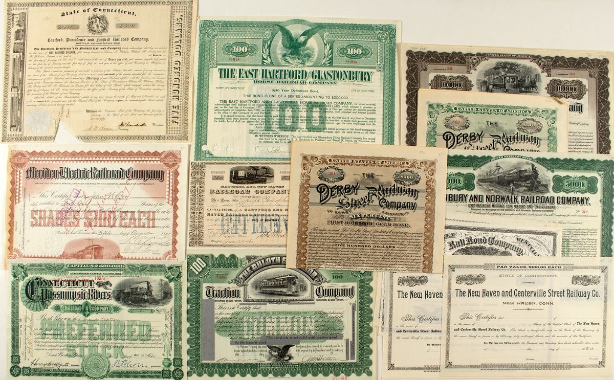 Lot of 19. Includes: Hartford, Providence & Fishkill Railroad Company (illustrated 1859 $500 bond, cut cancelled), Hartford & New Haven Railroad Co. (1861 illustrated stock, stamp cancelled), New Haven & Centerville Street Railway Co. (3 unissued 18--), Fair Haven & Westville Railroad (unissued 190-, very pictorial), Duluth Superior Traction Co. (unissued 19--), Connecticut & Passumpsic Rivers Railroad (1918, not cxl), Danbury & Norwalk Railroad (unissued $5000 bond), The East Hartford & Glastonbury Horse Railroad (1897, punched), Derby Streey Railway Co. (1894 unissued bonds), The Nauqatuck Railroad (unissued bonds), and The Consolidated Railway (unissued bonds). Very pictorial group! Please inspect. (Prag Collection) City: State: Connecticut Date: 1859-1918 hwac# 34625