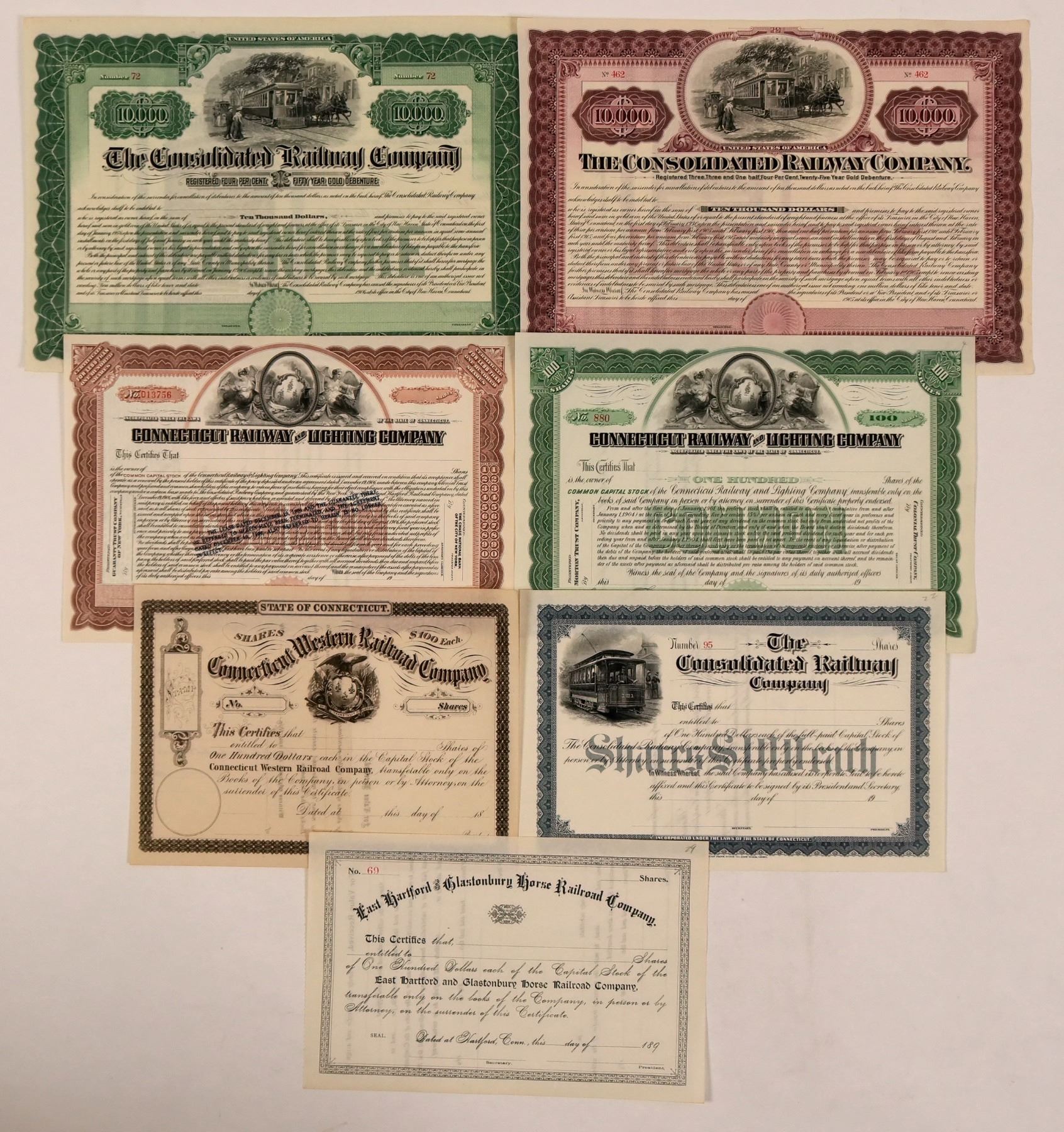 Nice group of unissued railroad stocks from Connecticut include Connecticut Western Railroad, East Hartford & Glastonburg Horse Railroad Co, Connecticut Railway & Lighting Company (2), Consolidated Railway Company, common stock with electric streetcar, and two Consolidated Railway Company Debentures, green and pink in $10,000 denominations.