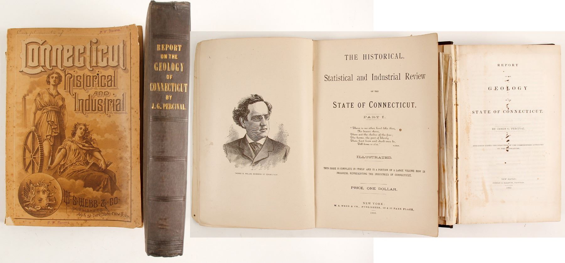 "Report on the Geology of the State of Connecticut" by James G Percival, Gordon & Baldwin, Printers. This is a 495-page description of the geology of Connecticut in 1842 written in the terms of the best geologic science of the day. What makes this an especially rare volume is a detailed geologic map mounted behind the front cover. The map is creased but otherwise in excellent condition. The original binding is intact and also in great condition. The second volume in this lot is "The Historical, Statistical, and Industrial Review of the State of Connecticut, Part I, published by W.W. Webb & Company in 1883. It contains information about specific men and companies in Connecticut. The information is organized by counties, then in alphabetical order by the names of individuals or companies. The index lists the names of the people and companies. City: State: Connecticut Date: 1842, 1883