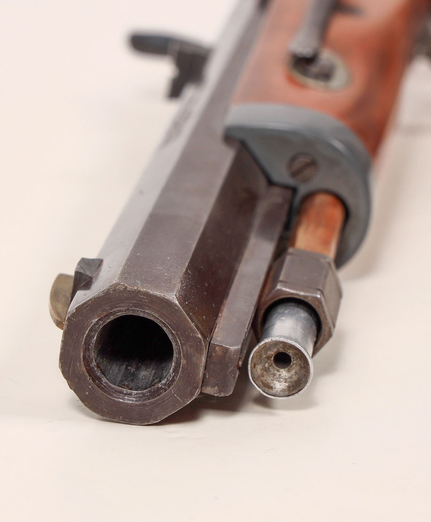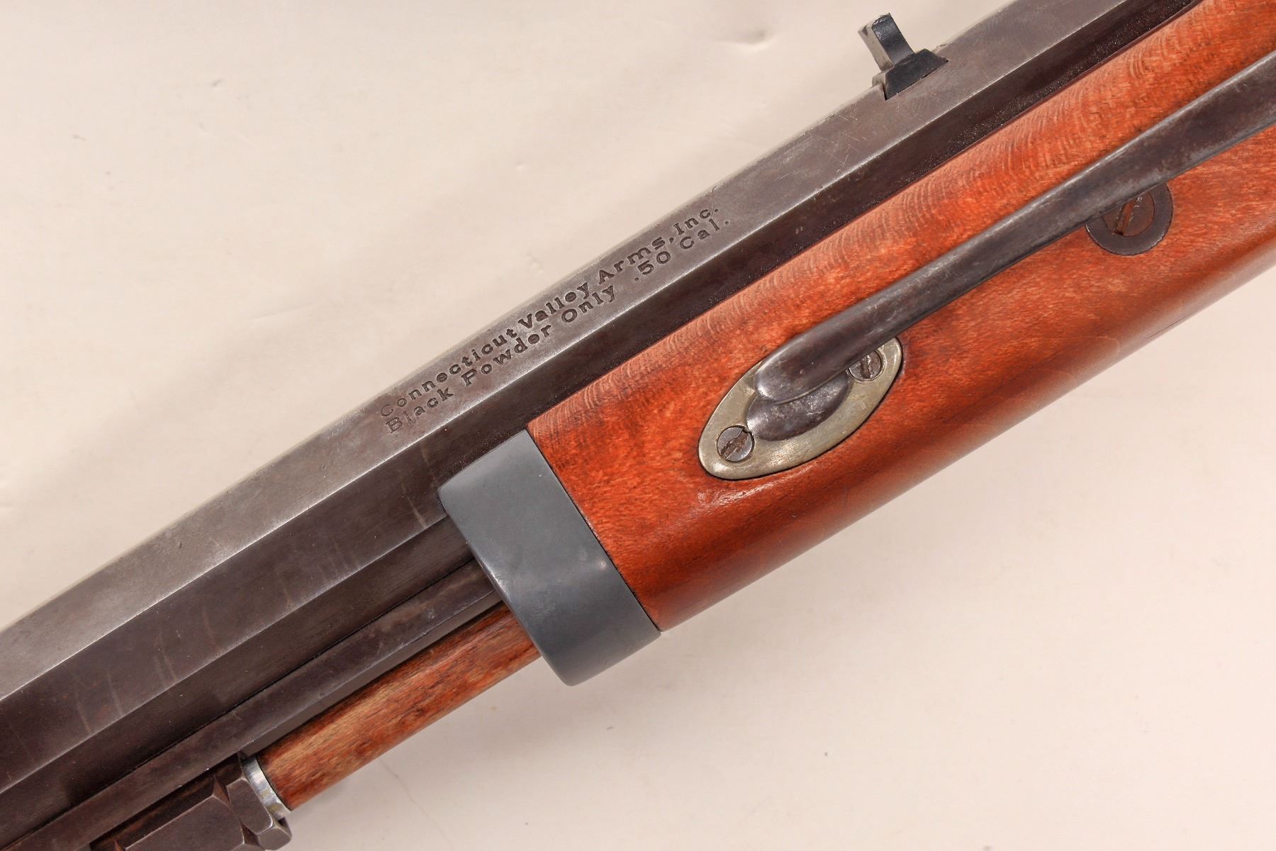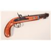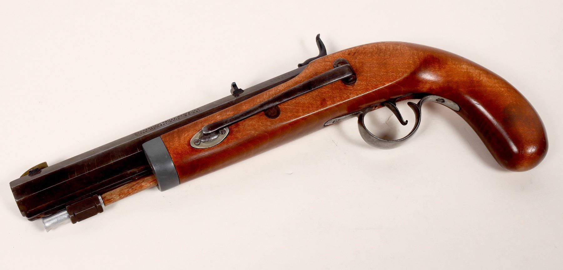 This muzzleloading pistol was made by Connecticut Valley Arms Co. (CVA) S/N 000471. At .50 cal. the gun has an 8.75 in. barrel with a soft browned barrel. The CVA address is in two lines on the outside flat. Very good condition. Loaded with a dry ball. 14.5 overall length. C.1970-1980's. No FFL required. No sales to New York, New Jersey, California, or Hawaii. Please see photo for details.