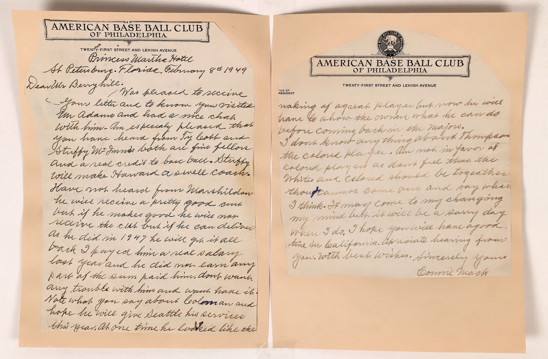 Fascinating two page letter on letterhead from the American Base Ball Club of Philadelphia. Dateline St. Petersburg, Florida, February 8th, 1949. Handwritten letter addressed to Mrs. Berryhill. "Pleased that you have heard from Ty Cobb and Stuffy McInnis. Both are fine fellows and a real credit to baseball. Stuffy will make Howard a swell coach." Also mentions players Marshildan(?) and Colman. Then Mack starts discussing black players: "I don't know anything about Thompson, the colored player. Am not in favor of colored players as don't feel that the whites and colored should be together though cannot come out and say what I think. It may come to my changing my mind but it will be a sorry day when I do." Signed Connie Mack. Pages have been trimmed and attached to album pages. Mack was a professional baseball catcher, manager, and team owner. The longest-serving manager in Major League Baseball history, he holds untouchable records for wins (3,731), losses (3,948), and games managed (7,755). Mack managed the Philadelphia Athletics for the club's first 50 seasons of play, starting in 1901, before retiring at age 87 following the 1950 season, and was at least part-owner from 1901 to 1954. He was the first manager to win the World Series three times, and he is the only manager to win consecutive Series on separate occasions. Mack was elected to the National Baseball Hall of Fame in 1937.