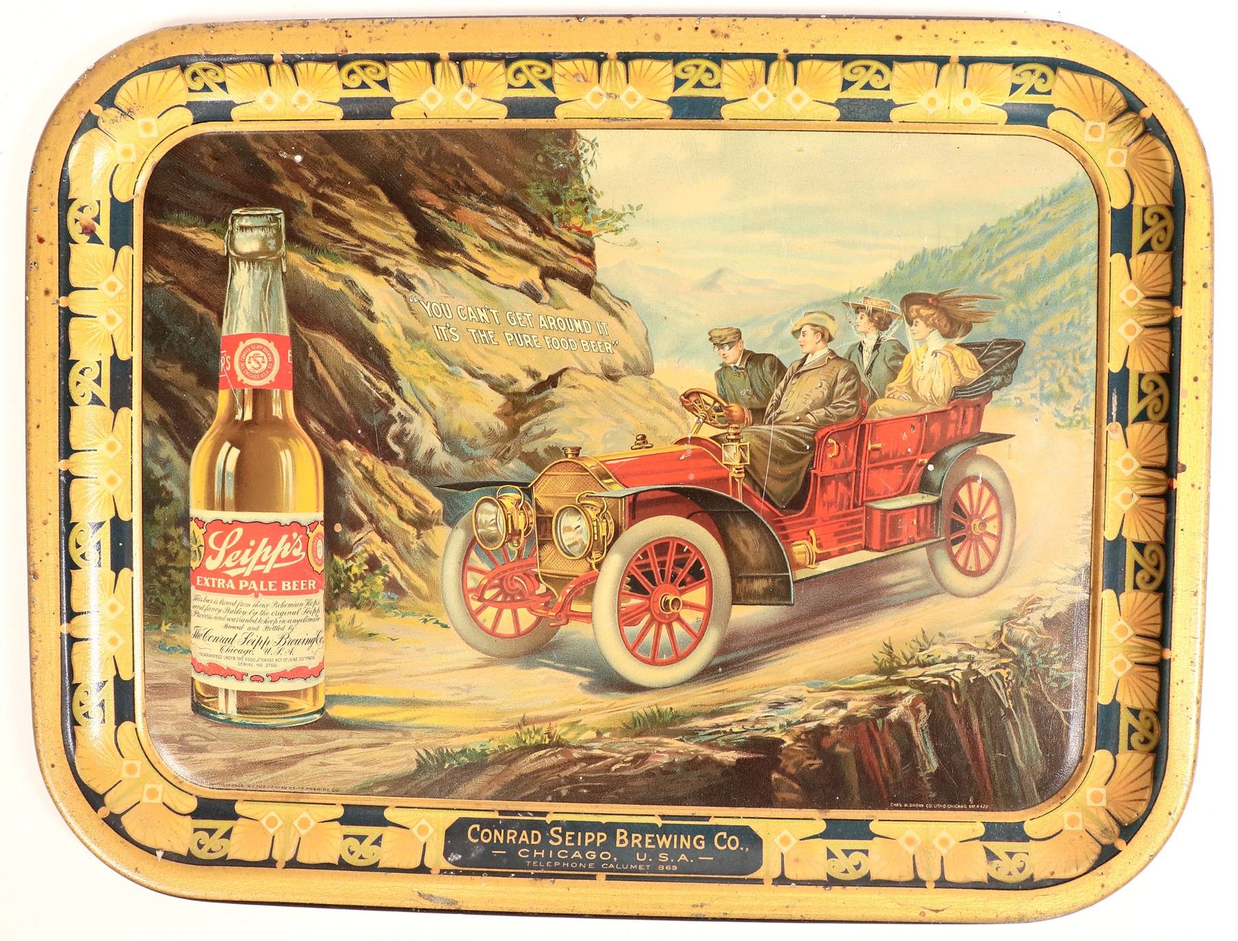 This beer tray is 10.5 in. X 13.25 in. from the "Conrad Seipp Brewing Co./ Chicago, U.S.A. /telephone calumet 869". "You can't get around it, it's the pure food beer". The scene depicts a 1920's open car with white tires. Recognizing beer as a food group-ahead of is't time. Light oxidation on the rim. Good condition, post prohibition. Chicago Illinois c. 1920s