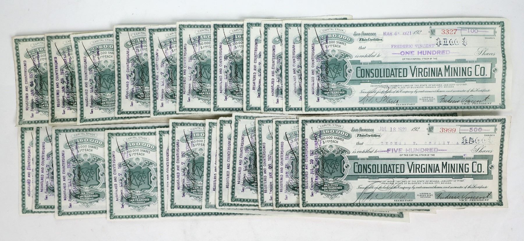 25 issued. Con-Virginia Mining Company Ò Virginia Mining District, Nevada. The Company was capitalized at $5,000,000; 5,000,000 shares at $1.00 each and incorporated in San Francisco on January 12th, 1921. The Company was resurrected when Cyanide leaching of the ore replaced Mercury. It was capitalized at $2,160,000; 216,000 shares at $10 each and incorporated in San Francisco in November 1904. In July 1919. the company was reported out of debt for the first time in 30 years.