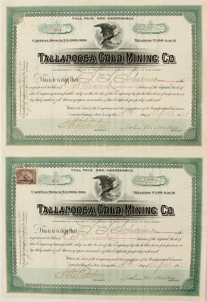 Numbers 203 and 204 issued in 1901 to SS Schurriner(?). One has a 50c document stamp on the other the stamp is missing the stamp. Signed by John R Miller president and ? secretary. This mine was incorporated in 1901. In 1901 Moody's Manuel of Corporation Securities reported that this company had purchased all of the property of the Royal Gold Mining Company. On site is a 40 stamp well equipped with all the necessary machinery. However, the 1902 United States Investor in answer to an inquiry says the company is still in existence, but the mines are not active. They are hoping to get their mine in Reading, Pennsylvania up and running in the Spring of 1902. But their mine in Georgia is not well thought of and an investment in the stock in not thought advisable. Too bad the owner of these stocks did not get this information. The stocks are in identical excellent condition. Both include a dog ear in the upper right corner that is barely discernable. No other edge issues, pin holes, rips, tears or staining. (Al Adams Gold Rush Memorabilia Collection) Date: 1901 Location: Tallapoosa, Georgia HWAC# 56928