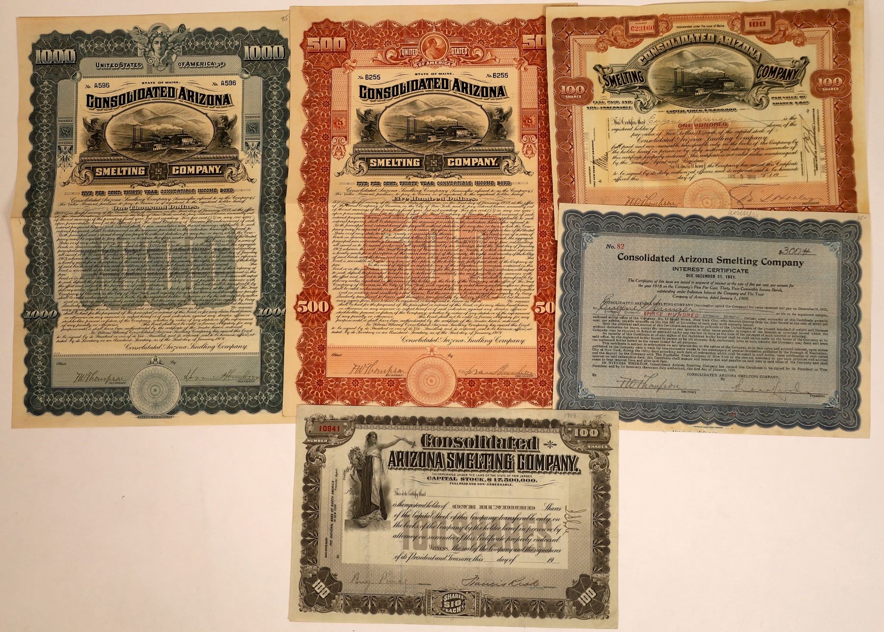 Lot of 5, all different. Includes: $500 bond (1909, not cxl); $1,000 bond (1909, not cxl); 1919 Interest Certificate; 1916 stock (not cxl), and 1908 stock (not cxl). Good to very good condition. Consolidation of the Arizona Smelting, Arizona Exploration and DeSoto Mining. They would operate the Blue Bell and DeSoto Mines. In 1909 only 82,250 pounds of copper was produced. By 1911 that number was up to 600,000 pounds. The company went into receivership in 1920.