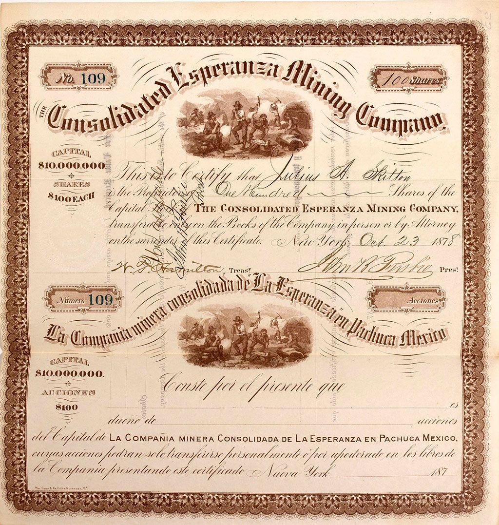 Stock Certificate 109, issued for 100 shares to Julius A. Skelton. Issued in New York. Uncancelled. Signed by President John R. Bisbee. Bilingual with Spanish in lower third. Several folds, Excellent Condition. The Pachuca District in Hidalgo, Mexico produced over 1.5 billion ounces of Silver and was one of the three most prosperous mining districts in the Americas. Pachuca has also produced over 7 million ounces of Gold. Date 1878 Pachuca, zMx hwac 10039