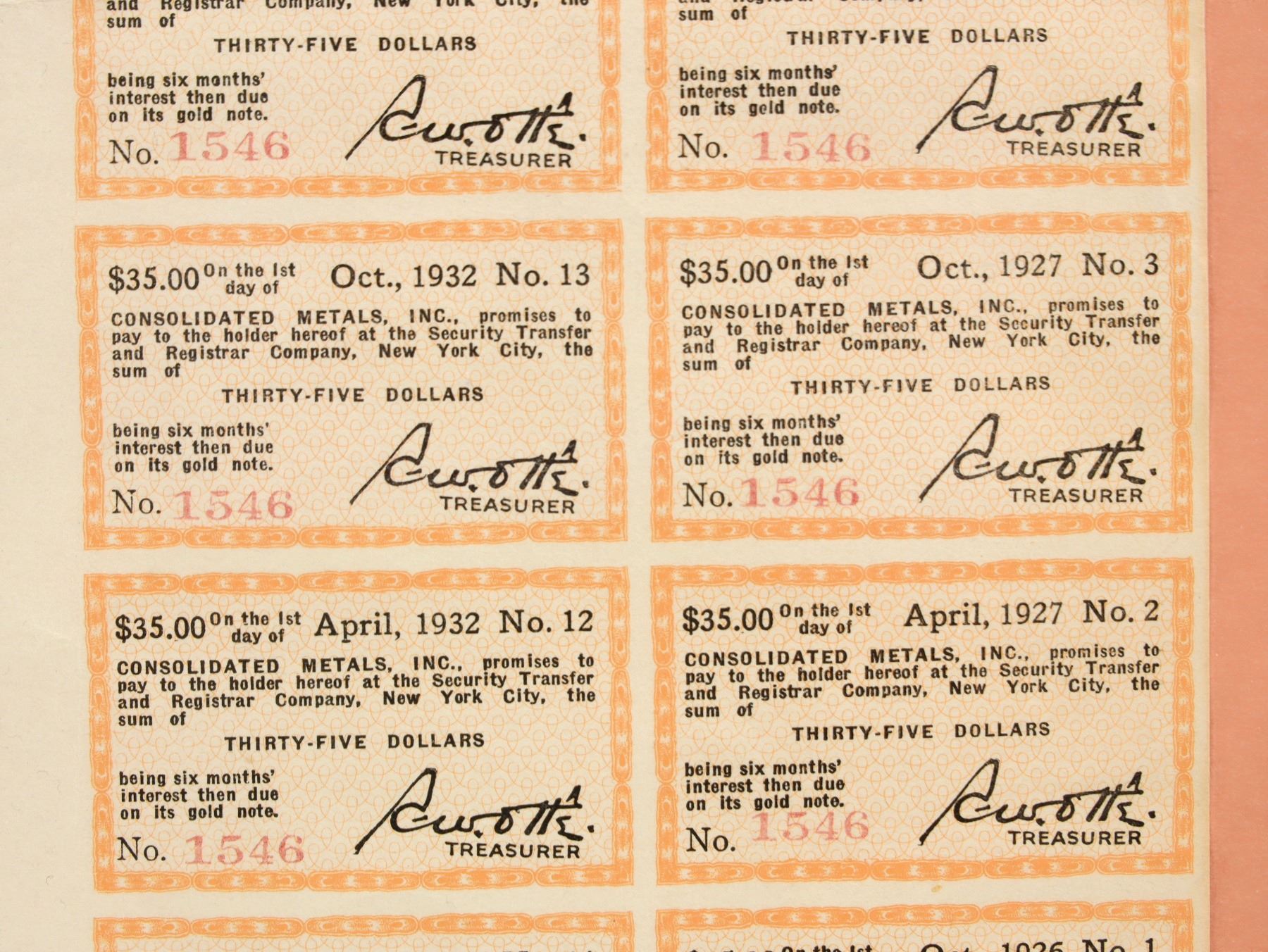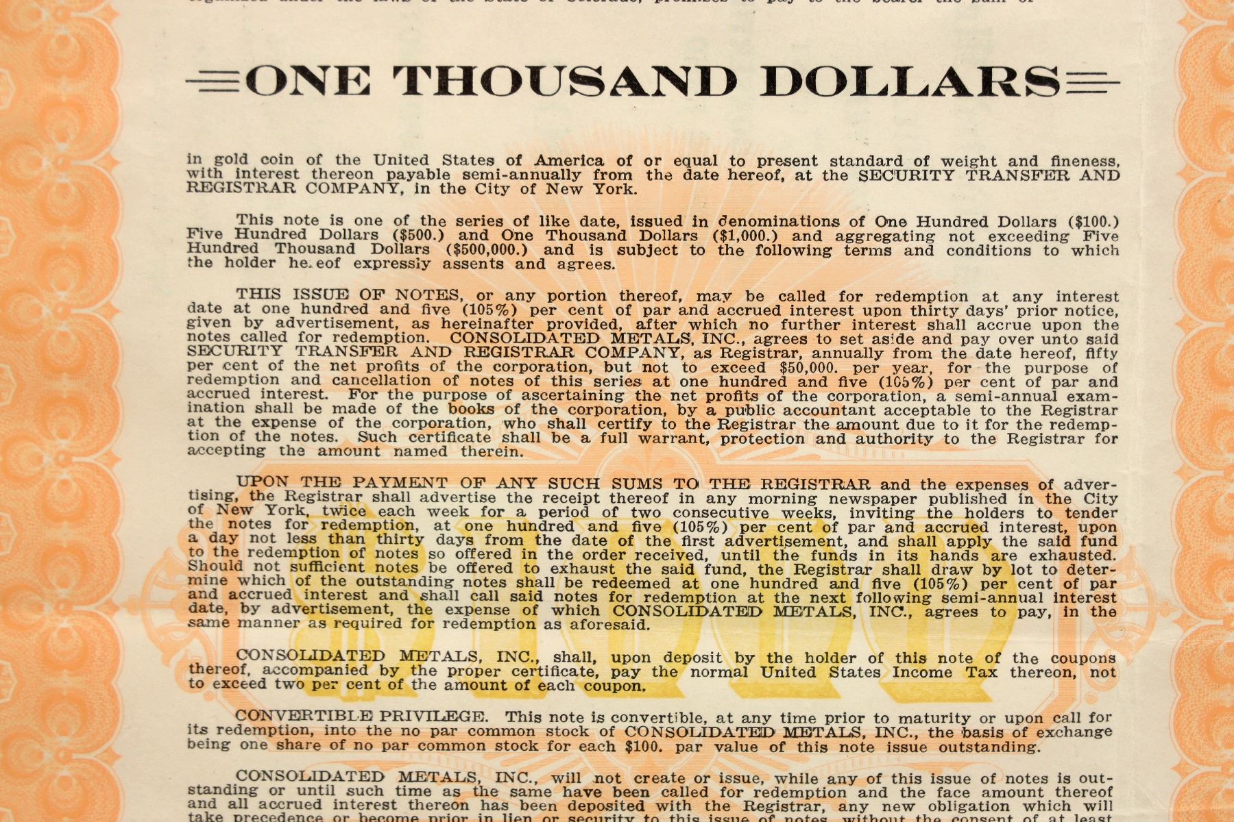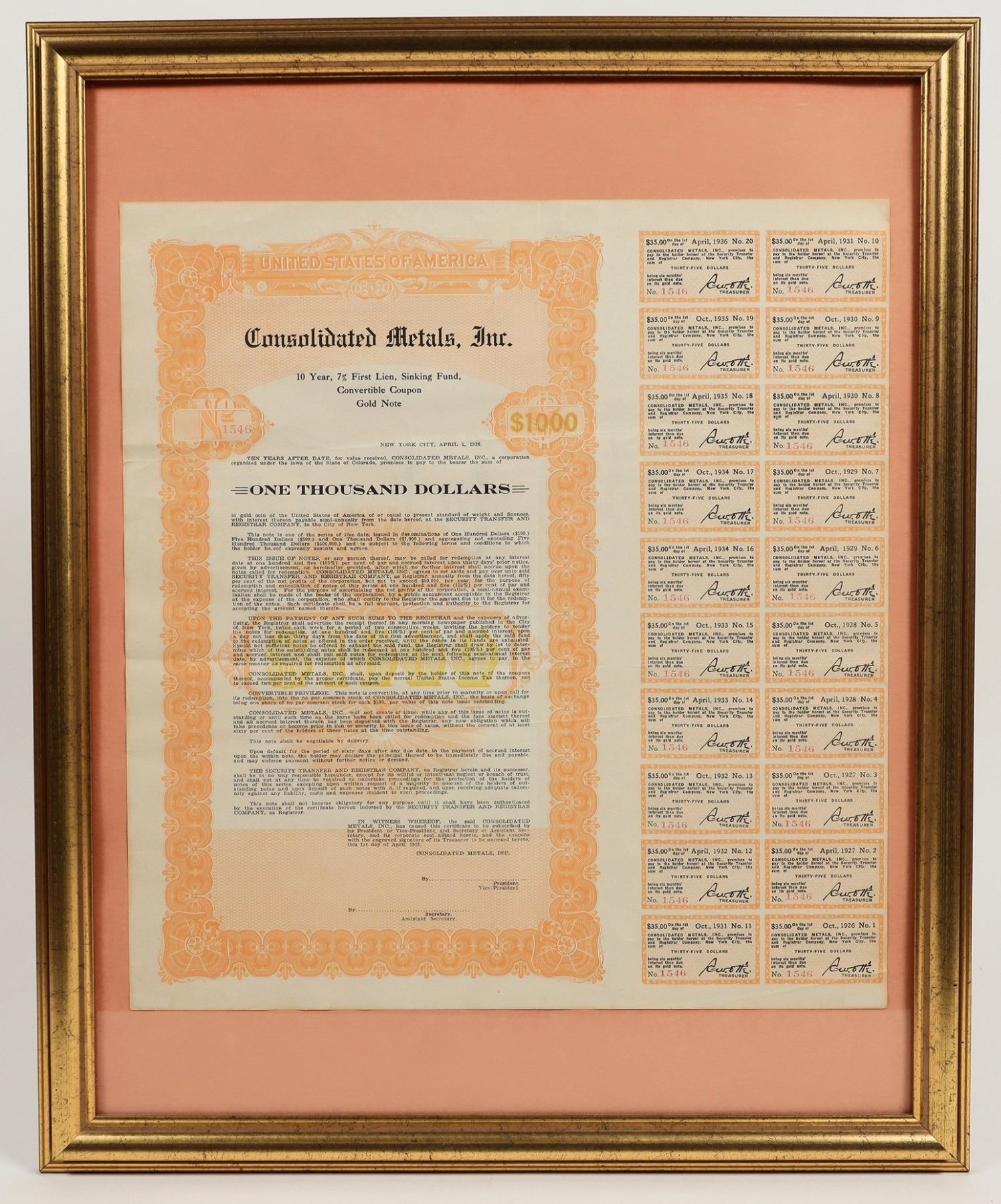 This is an unissued bond for $1000 by Consolidated Metals, Inc. of Colorado dated 1926. Unissued and unsigned with all coupons attached. An orange background document, matted in a peach color. This was a large mining operation out of Russell Gulch, Col. Framed at 18 in. X 22 in. Please see photo for details.