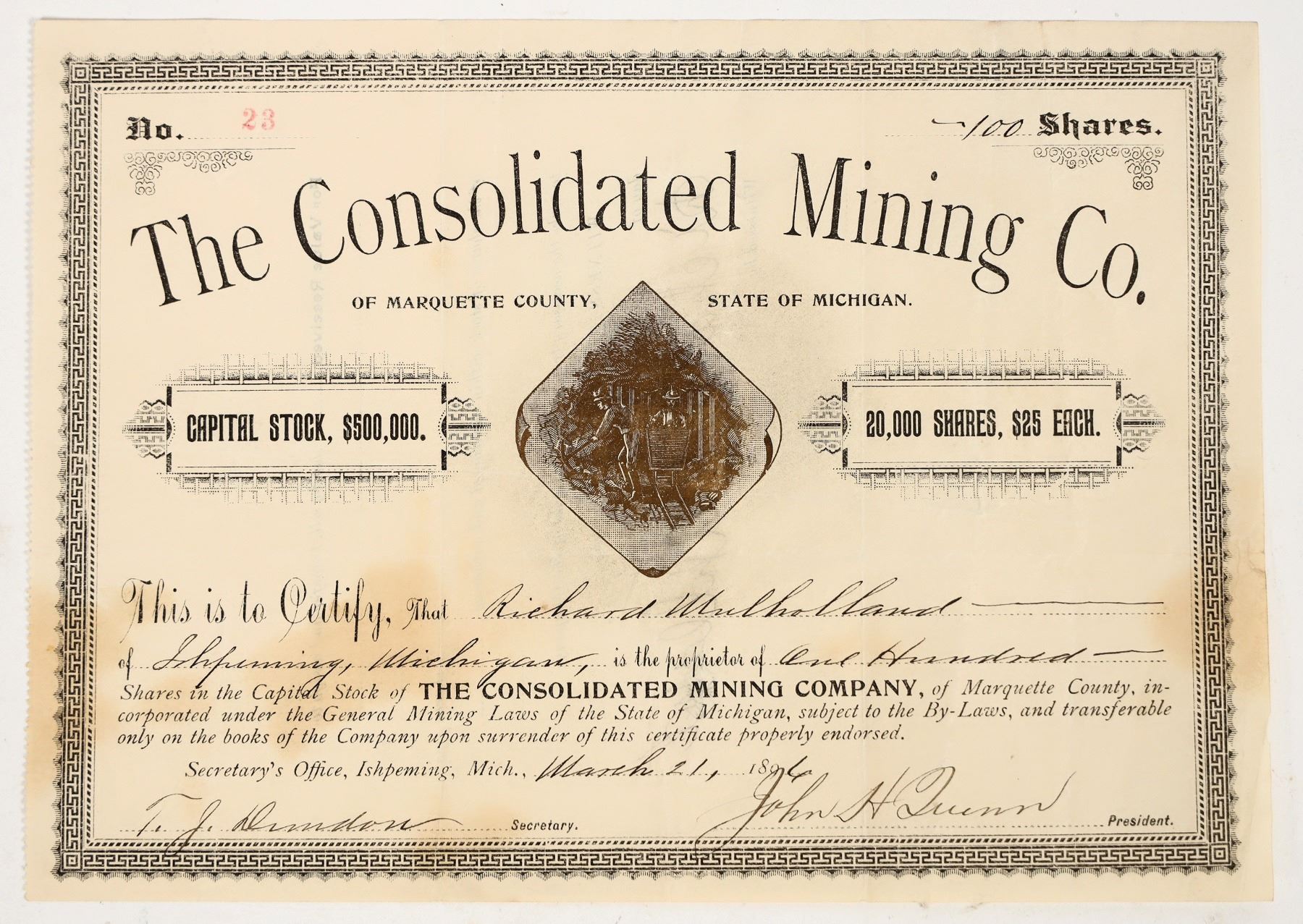 "of Marquette County, State of Michigan." No. 23, issued for 100 shares to Richard Mulholland in Ishpeming, 1896. Signed by president John Quinn and secretary Dundon. Not cancelled. Gilt underground mining vignette. Folds, staining. Not listed in DeGood. They owned the Mesabi Friend Mine and Richard's Mine (Diamond Drill, Jan. 11, 1896).