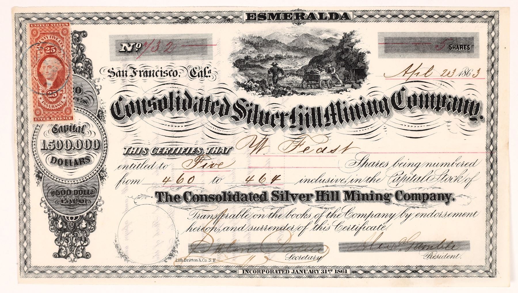 "Esmeralda" printed at top center. No. 732, issued for 5 shares to William Feast on April 23, 1863 in San Francisco. Signed by president Alex Gamble and secretary Solon Pattee (also the officers for the First North Extension). Not cancelled. Black border and print with vignette of two miners pushing a cart of ore away from a mine entrance. Lith. Britton & Co., SF. 25 cent US IR Insurance stamp at upper left with tied cancel. 5.5 x 9.9" Folds, clean. Braly, Cory & Hicks staked the first claims in the Aurora Mining District on Silver Hill on August 24, 1860. The first shipment of ore was made on November 10, 1860. Shortly thereafter the Esmeralda Mining Company and the Consolidated Silver Hill Mining companies were formed and incorporated. Although the certificate says the company was incorporated in January of 1861, the Daily Alta California reported that articles of incorporation for the company was flied early November 1860! They report the mines are in Mono County, said to be Calaveras County. William Feast was in Aurora by 1861. He owned a cabin on the northeast corner of Silver & Del Monte. He was the Mono County Treasurer and continued in this capacity after Aurora was proven to be in Nevada. Feast was the secretary of the West Wind, Fairy Queen, Utah, Gibraltar etc. He died in Aurora in 1864. Gamble was a very successful merchant in Big Oak Flat, California during the Gold Rush. He took that money and became a mining speculator and investor. His brother Peter and he were founders of the immensely successful Wide West Mine on Last Chance Hill. They sold their stock at a great profit and bought Real Del Monte stock cheap. Within a few months it had risen to $500 a share and Gamble was a millionaire. Not too long after that Governor R. K. Colcord of Nevada in his memoirs of territorial Aurora noted that he had fallen into poverty, "...his shirt was unlaundered and he was living in a two-bit restaurant."