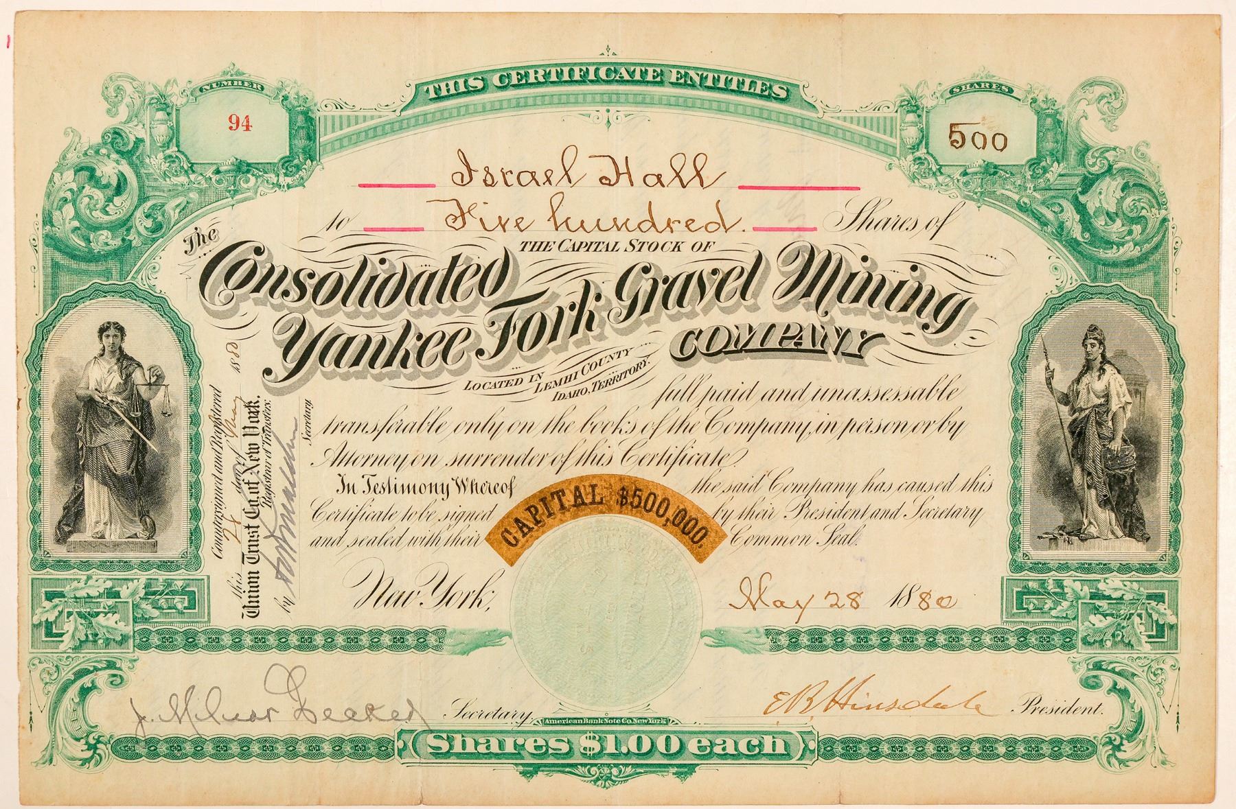 Rare. Located in Lemhi County, Idaho Territory (printed under title). No. 94, issued for 500 shares to Israel Hall on May 28th, 1880 in New York. Signed by president EB Hinsdale and the secretary. Not cancelled. Green border, black print. Two different allegorical vignettes. Printed by ABN. 7 x 10.5" Pinholes, heavy folds with some soiling on reverse. According to Burchard (1882), the company had 600 acres of gravel, average depth 60 ft. They were using a Little Giant or Monitor Chief with a 6-inch nozzle, 600 ft. of iron pipe, 2,000 cubic yards per day. They also have 1.5 miles of ditch and flume for water (pg. 191). Ken Prag Collection