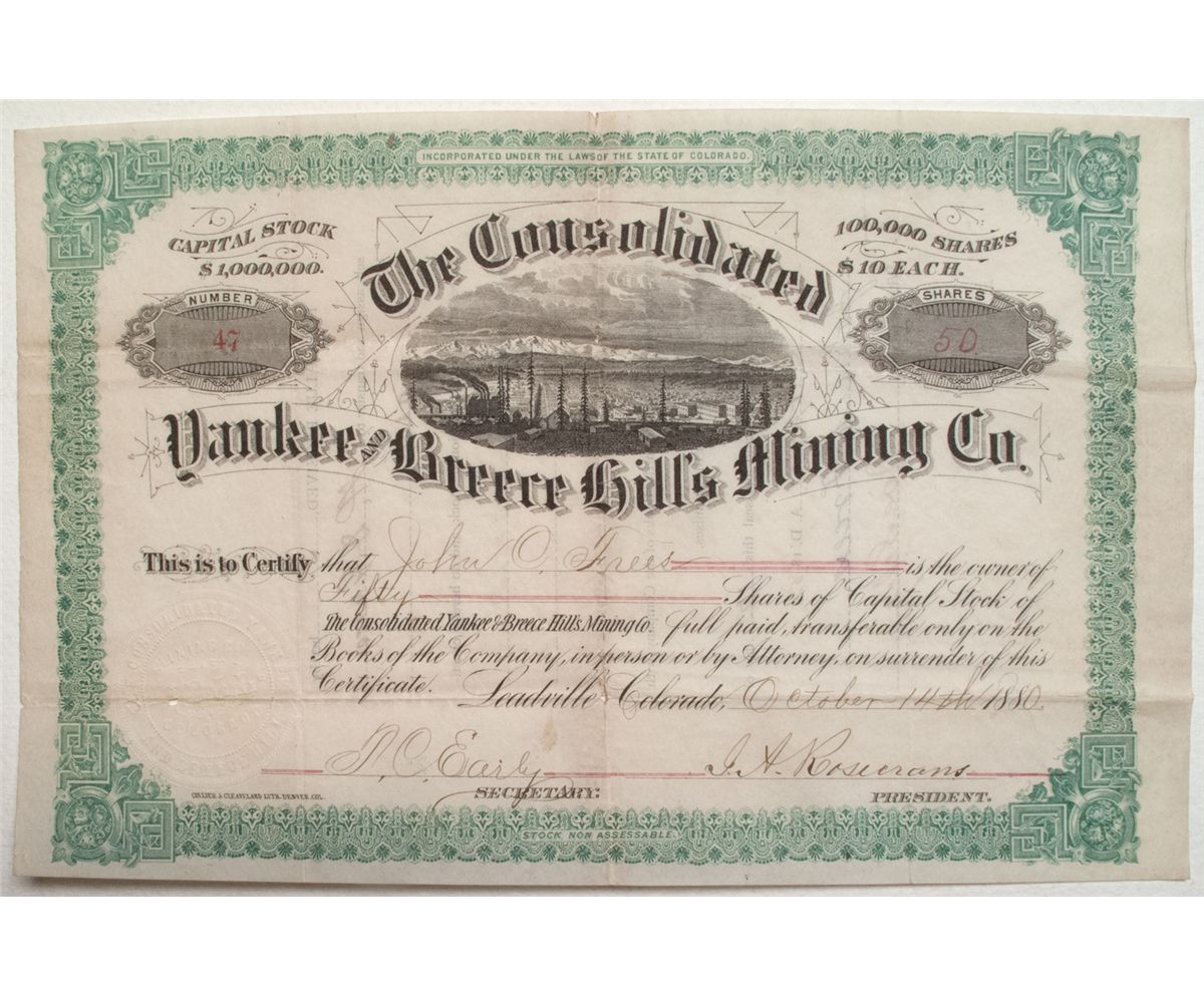 Incorporated in Colorado in 1880. Cert. #47, issued to John C. Frees for 50 shares. Signed by I.A. Rosecrans, president, and T.C. Early, secretary. Green border, central city-view vignette, embossed seal. U/C. Datelined Leadville, Printer: Collier & Cleveland, Lith., Denver. This is another of the mines from the rich Leadville region. Folds and some toning on margins. Rare. VF. Date 1880 Leadville, CO hwac 9969