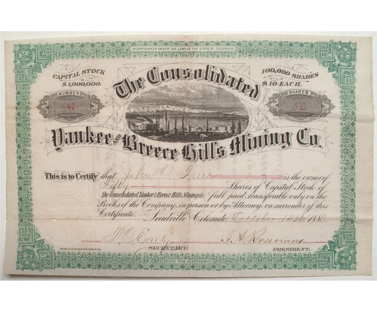 Incorporated in Colorado in 1880. Cert. #47, issued to John C. Frees for 50 shares. Signed by I.A. Rosecrans, president, and T.C. Early, secretary. Green border, central city-view vignette, embossed seal. U/C. Datelined Leadville, Printer: Collier & Cleveland, Lith., Denver. This is another of the mines from the rich Leadville region. Folds and some toning on margins. Rare. VF.