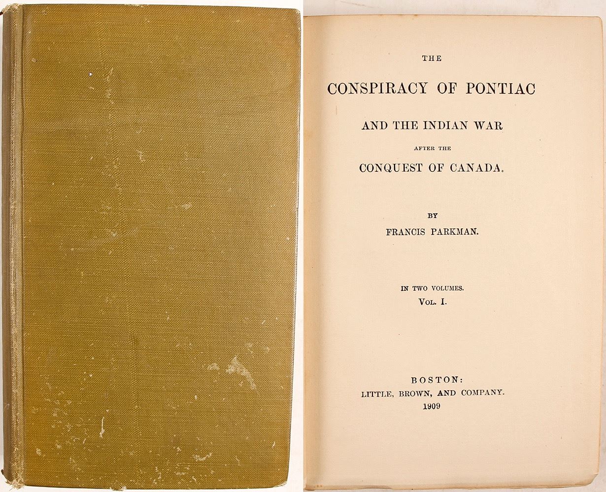 The Conspiracy of Pontiac and the Indian War After the Conquest of Canada by Parkman, Vol. 1 of 2 only. Cover has wear, spine has top and bottom heavy wear. (Potter Collection) HWAC# 63303 Date: 1909 Location: