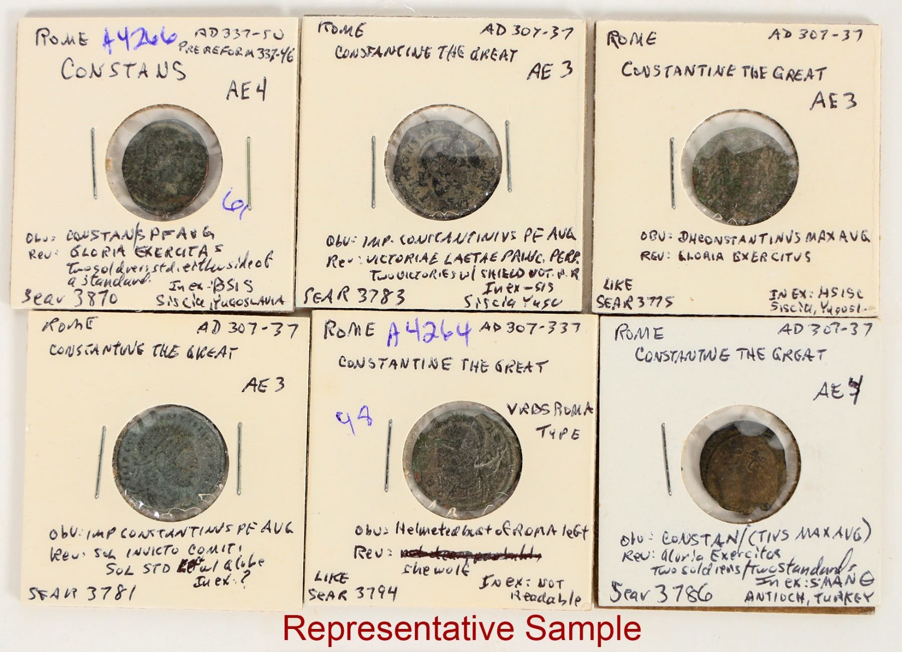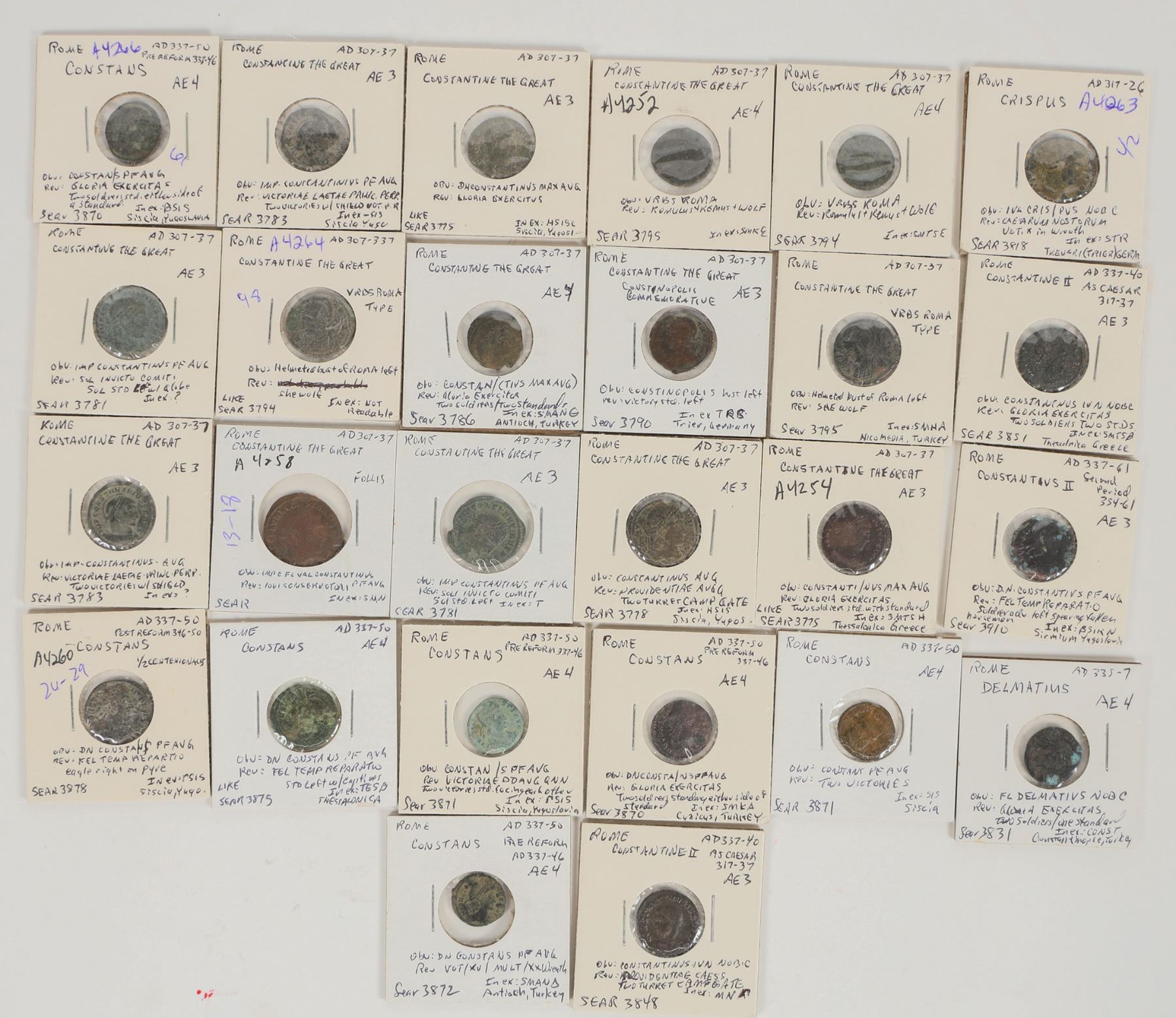 Good to very fine condition, a nice assortment of mints and designs. All identified in 2 x 2 cardboard holders. Constantine the Great (15); Constaus (7); Crispus; Constantine II (2); Dalmatius; Constantius II (8).