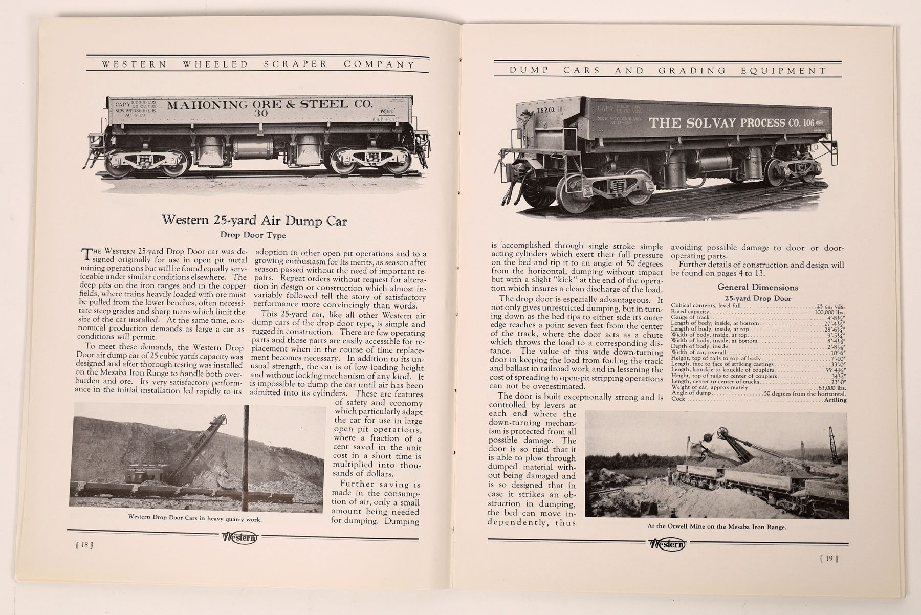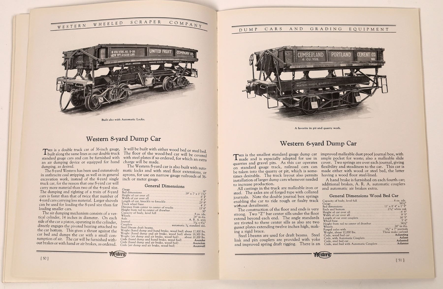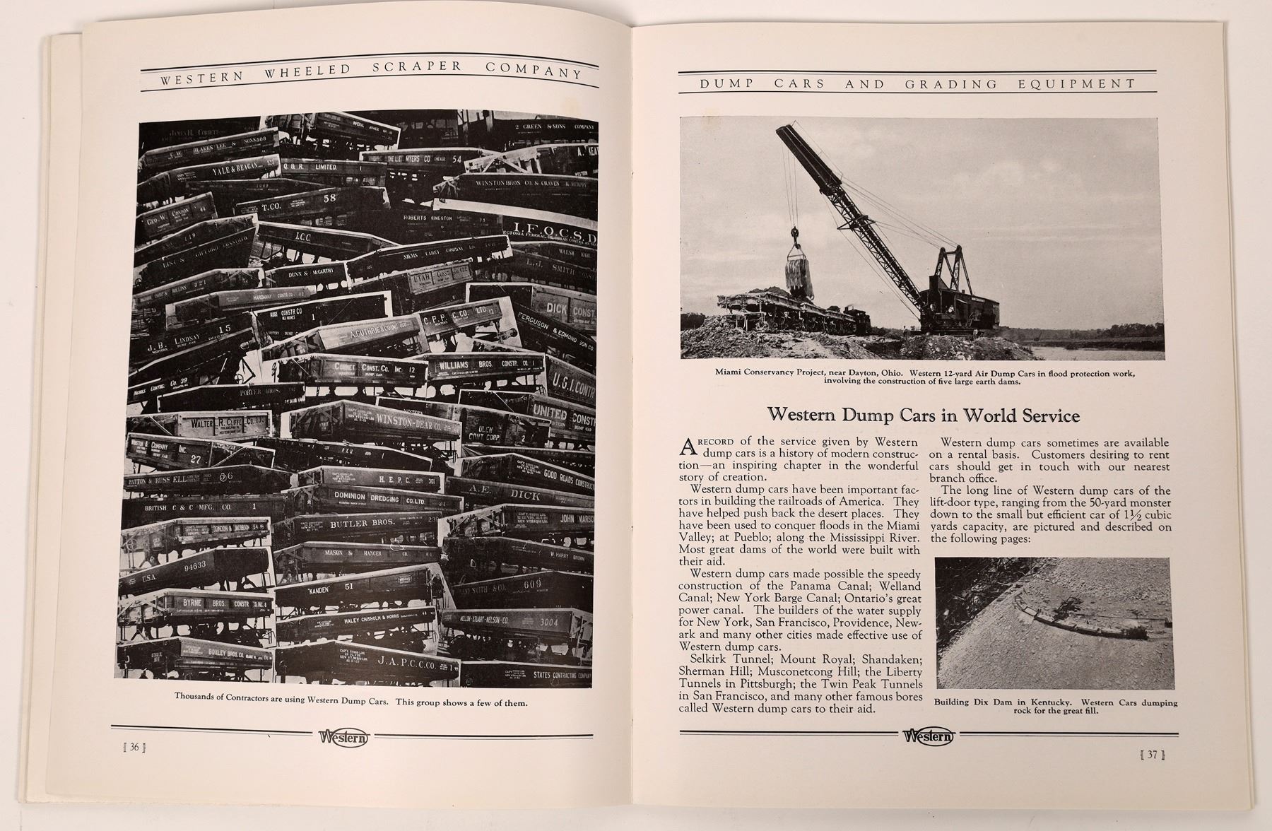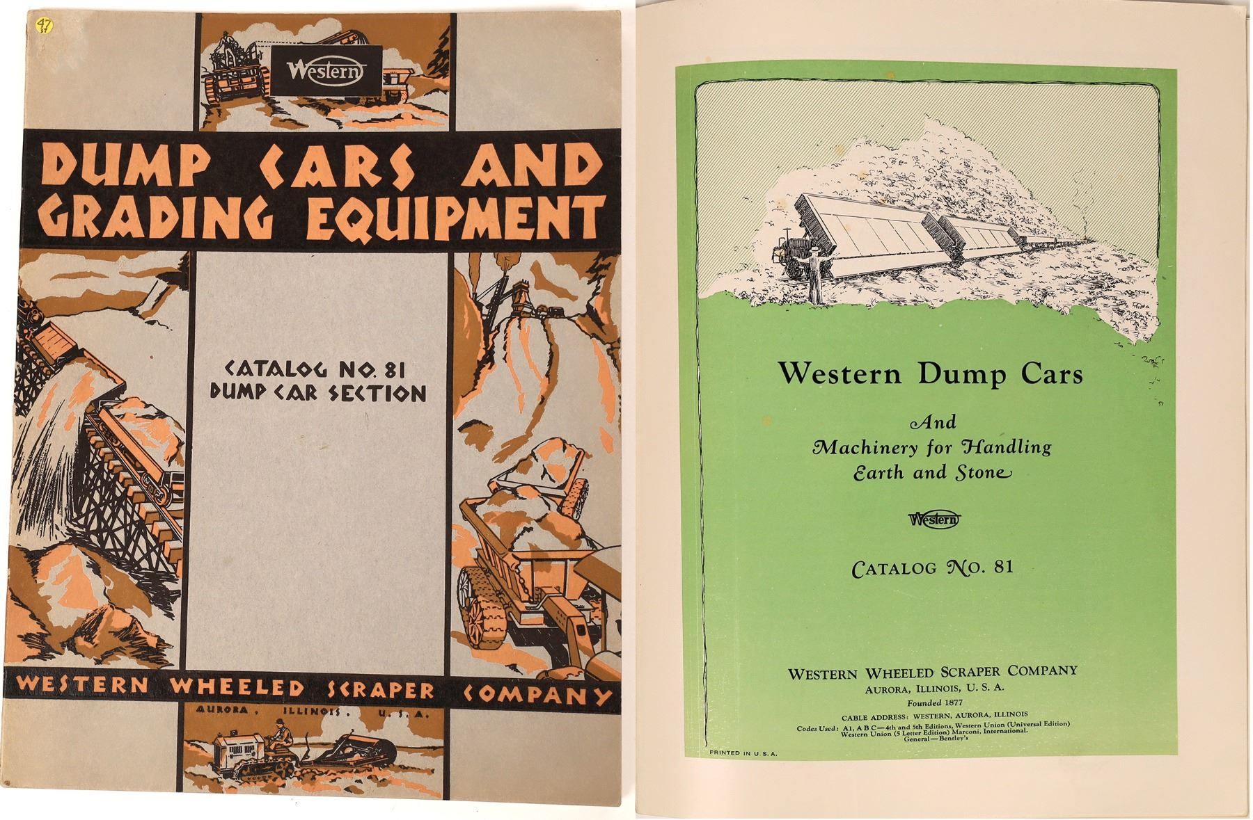 Cardboard covered book titled Western Dump Cars and Grading Equipment, Catalog No. 81 Dump Car Section, published by Western Wheeled Scraper Company, Aurora, IL. No copyright date but stamp on back cover states Received Nov 10 1930 Construction Dept. so book dates on or before 1930. 72 pgs, 8.50" x 11". Each page includes one or more B&W photos of earthmoving equipment including dump cars and coal cars along with scenes from strip mines, asbestos mines, work w/railroad lines, etc..