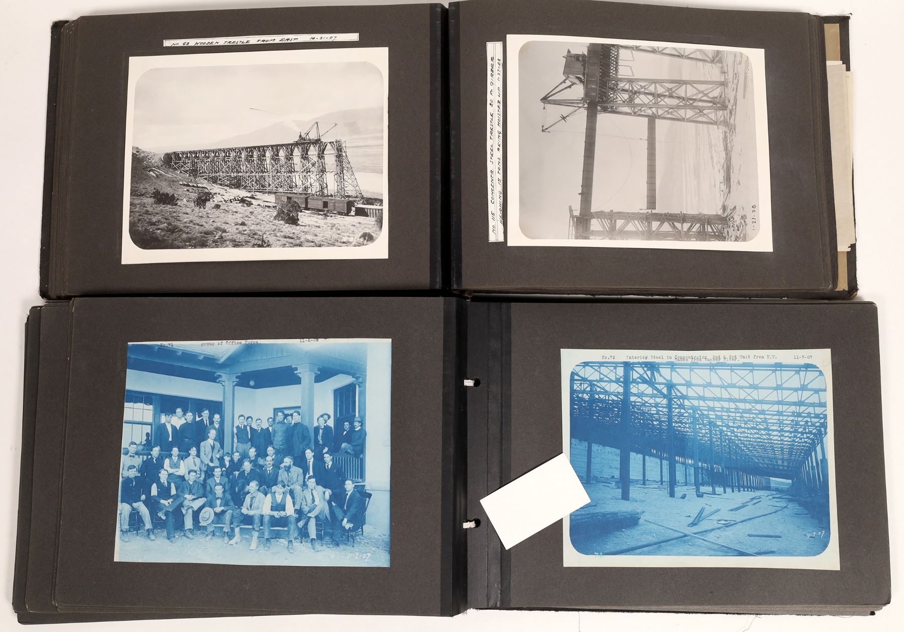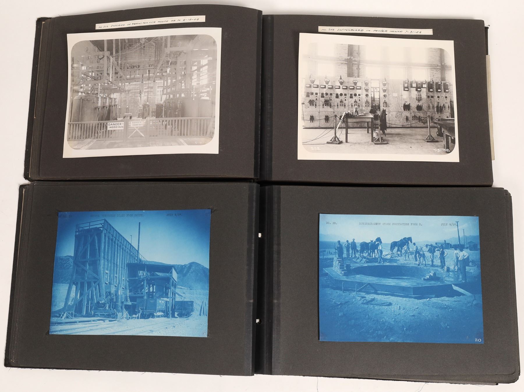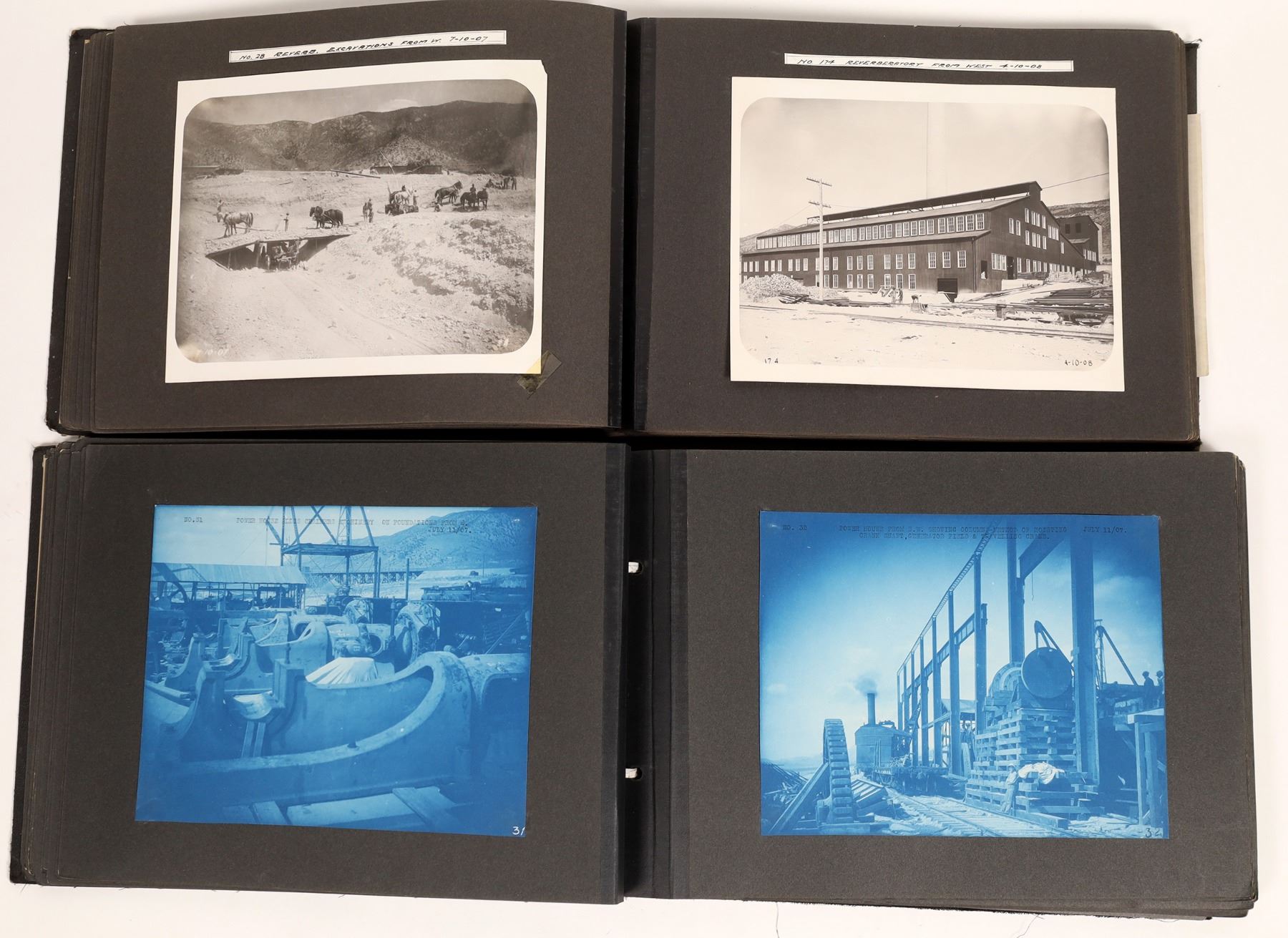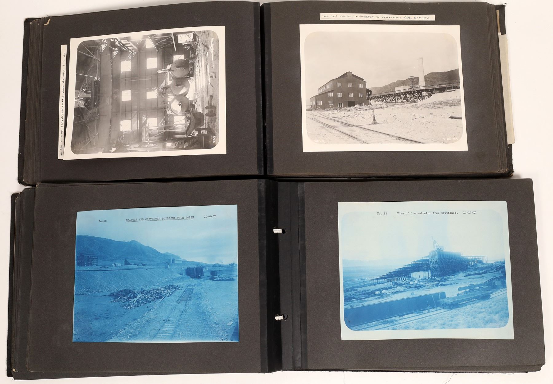 These two albums contain photographs and diazo copies of photographs of the construction of the concentrator and smelter by Nevada Copper Corporation from 1907 to 1908. This facility processed copper ores from the mines around Ruth, just west of Ely, Nevada. The scale of the construction recorded in these photos is amazing and includes construction of a high wooden trestle to bring ore to the top of the concentrator building, the foundation and subsequent raising of the reverberatory furnace smokestack, the installation of a hydro-electric powerhouse and so much more. One album includes eight-two, 8 x 10-inch, black and white photographs (and one blue & white diazo copy photo) that chronicle the construction of the McGill concentrator and smelter along with photos of the Ruth and Veteran mines. This includes three black and white negative panoramas of the Ruth townsite. The other album, labeled Chief Engineer's Office, contains ninety-four, 7.5 x 10-inch, blue & white diazo copies of black and white photos, a few repeated from the first album, that have been annotated with handwritten and typed information. Almost every photo in both albums are labeled with their location and the direction of view. In 1932, Kennecott Copper Company acquired the McGill facility and operated it until declining grades at the Ruth mine and falling copper prices worldwide forced the closure of Kennecott's entire McGill operations. The enormous site has since been demolished and cleared -- leaving bare ground between the remaining town of McGill and the Duck Creek Mountain Range -- and nothing but these photographs to memorialize the monumental work that was done there at the turn of the 20th century.
