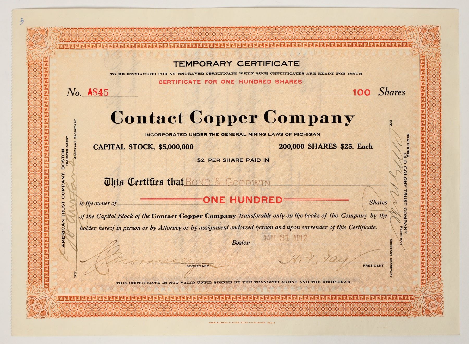 Temporary Certificate no. A845, issued to Bond & Goodwin in 1912. Signed by president Fay and the secretary (Morrisey). Black print, orange border and background. 7.75 x 10.5" DeGood pgs. 93-94, R-6. Company had 2,300 acres near Donken. Only Temporary Certificates are known.