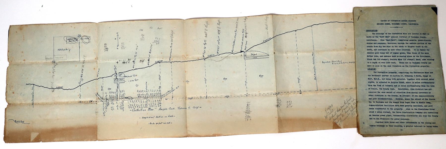Report and map of the Contention Mining Property in Knights Creek, Tuolumne County, California. Report includes information about the mine including location, development, ore estimates, labor costs, etc. Map shows a longitudinal section on the lode. The Contention Mine produced some great gold leaf specimens. Report is 12.75 x 8.5 inches; map is 35.5 x 11.75 inches. Good condition.