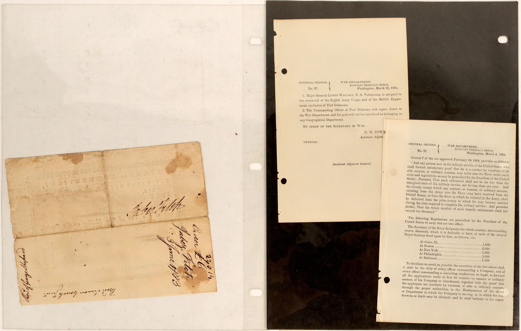 Three pieces: 1) For the Payment of Comptroller's Office, May 07th 1791, James Baldwin is entitled fourteen shillings and eight pence...signed Ralph Pomeroy. Printed by Hudson and Goodwin, Hartford; 7 x 4 inches, holed. 2) Sir, Pay the Army Comptroller Twenty Five pounds in Bills of this State and charge the State Pay Table Office March 22d 1781,signed John Lawrence Esq. Treasurer. 8 x 6 inches, endorsed on reverse. (John Lawrence was treasurer of Connecticut from 1769-1789) 3) State of Connecticut Pay Table Office 3 June 1783, Pay Capt. Jabez Fitch Six Pounds, signed William Moseley, endorsed on reverse. 6 1/2 x 5 inches. The diary of Jabez Fitch (1737-1812) is a primary resource in the Battle of Long Island August 1776. Also two general orders from the War Department dated 1864.