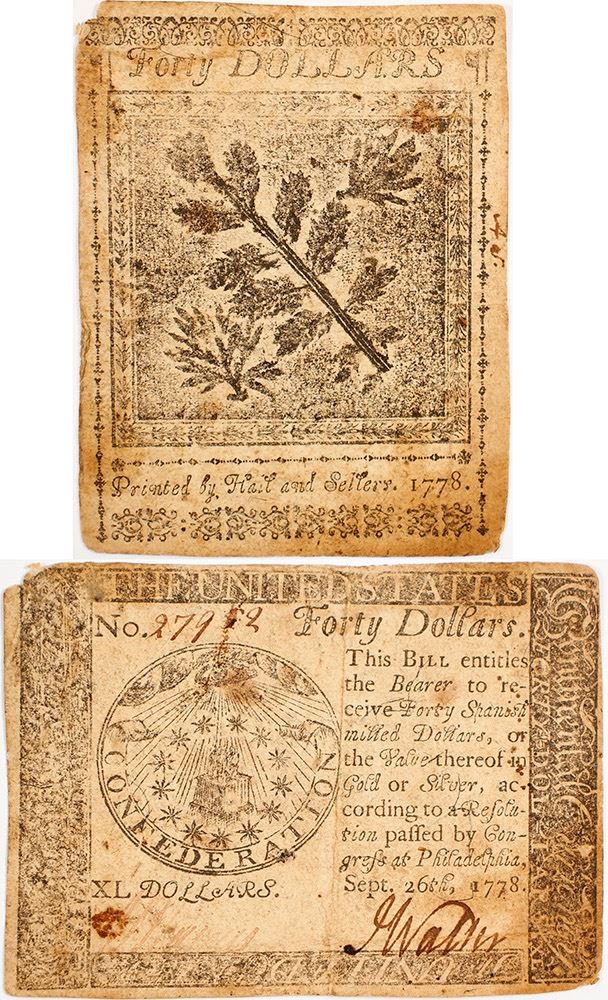 Forty Dollar note issued by the Continental Congress. CC-84. HWAC# 61078 Date: 1778 Location: Philadelphia, Pennsylvania