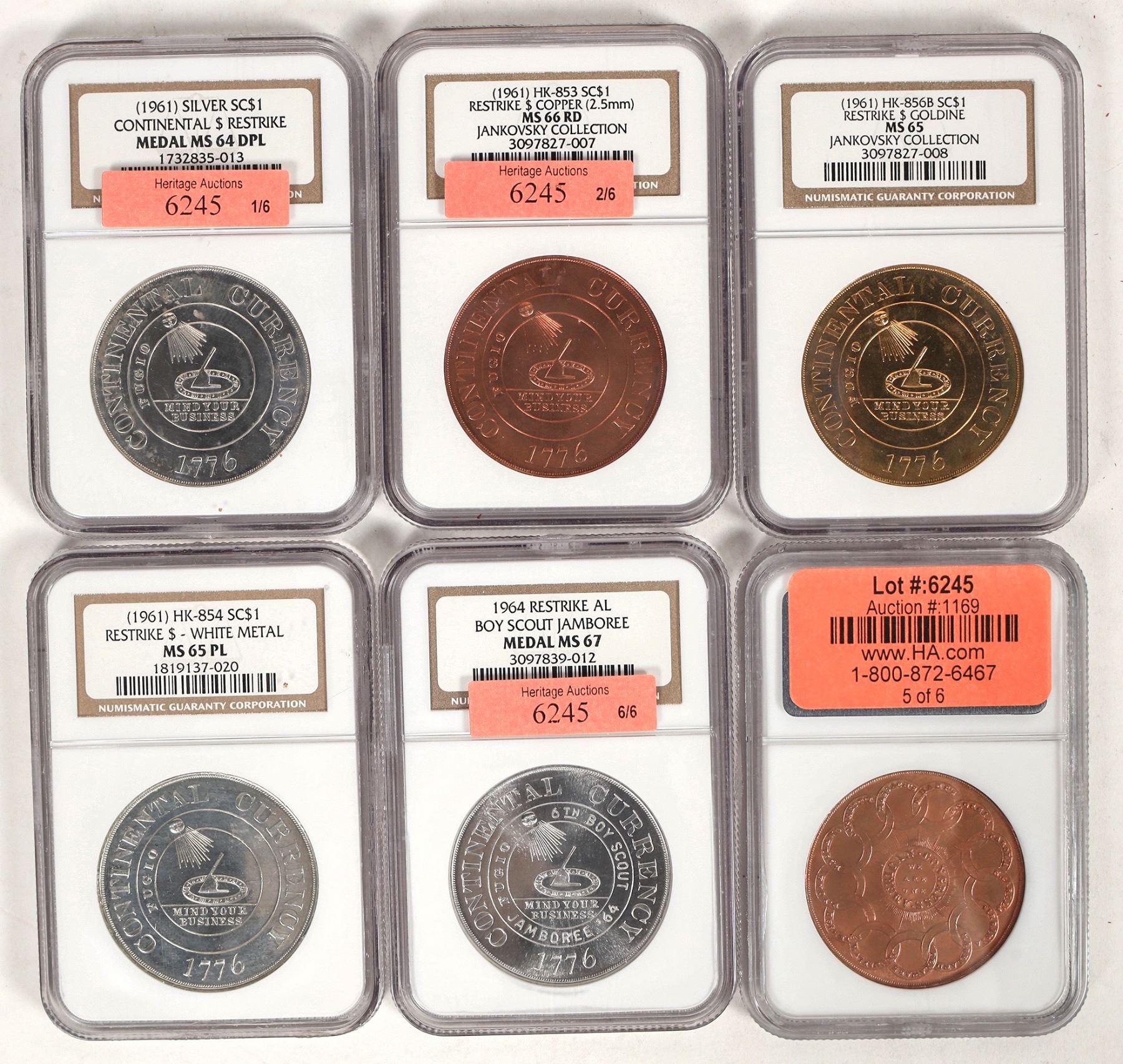 Six NGC graded Continental dollar restrikes: 1) 1961 HK-854 white metal MS 65 PL; 2) 1961 Silver MS 64 DPL; 3)1961 copper MS 66 RD; 4) 1961 HK-856B goldine, MS 65; 5) 1961 HK-856B bronze, MS 63 RB; 6) 1964 Aluminum Boy Scout Jamboree MS 67.