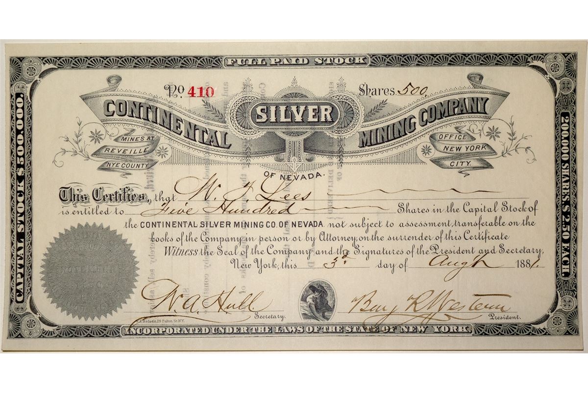 Uncancelled, no. 410 issued to W. F. Lees, 500 shares signed by Benjamin. R. Western, president and W. A. Hull, secretary. Reveille (Nye County) was started in 1866. Within a year 50 mines were being developed. A stamp mill was built in 1867. By 1880 the town was dead, but operations continued off and on until 1945. Black print on crème paper. Small vignette of woman in a bonnet in circle at bottom center. Embossed seal at bottom left.